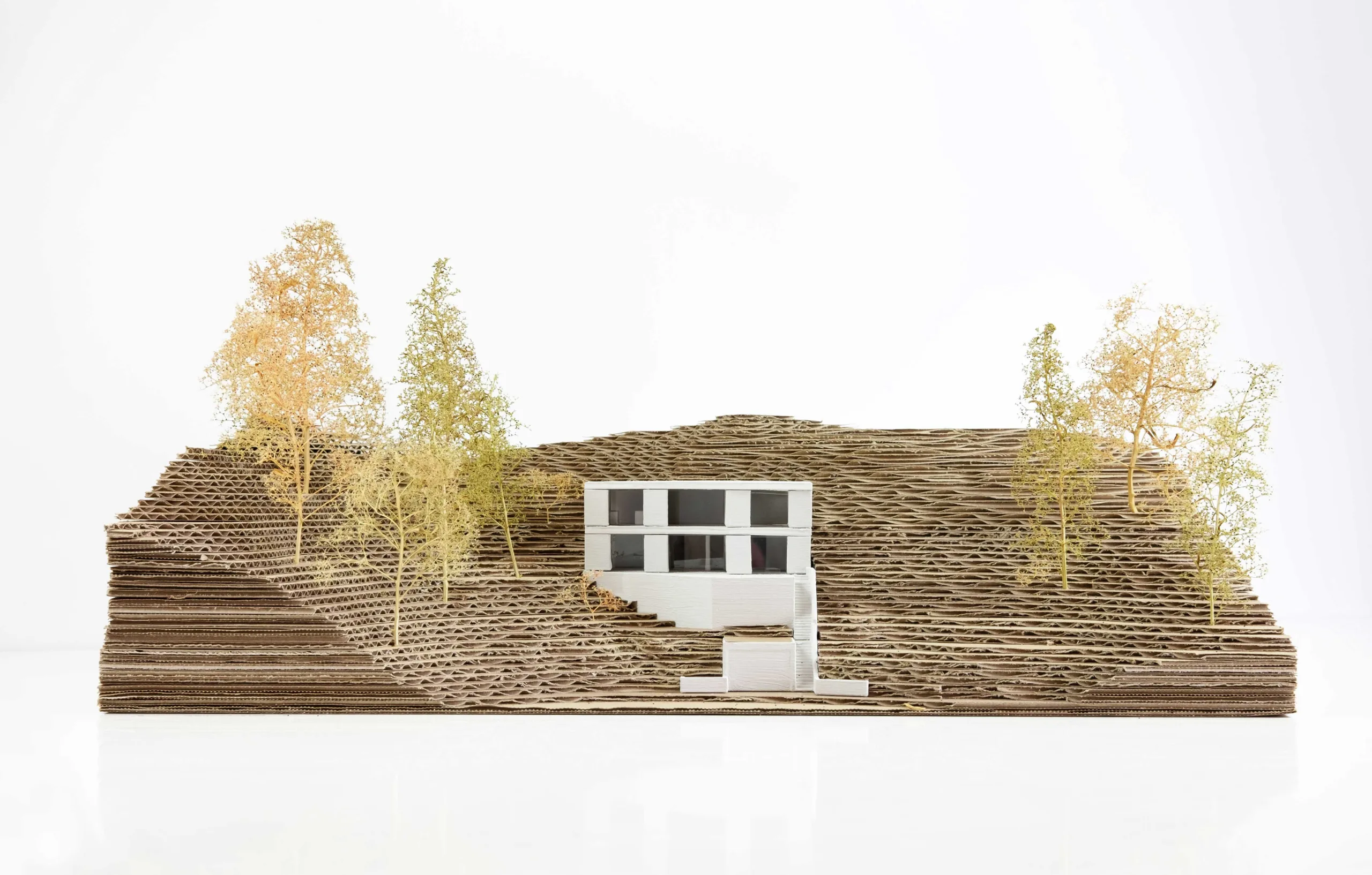 The volume looks simple and abstract, the angled lines and corners create an interesting shape: a sharp diamond in the landscape. The materialization is serene and restrained with an alternation of local materials. Integral sustainability measures maximize passive use of climatic conditions, provide a pleasant indoor climate and significantly reduce energy costs.