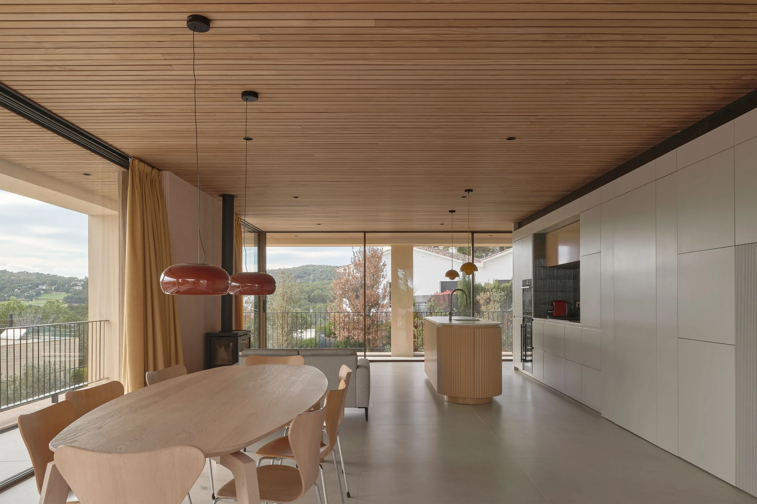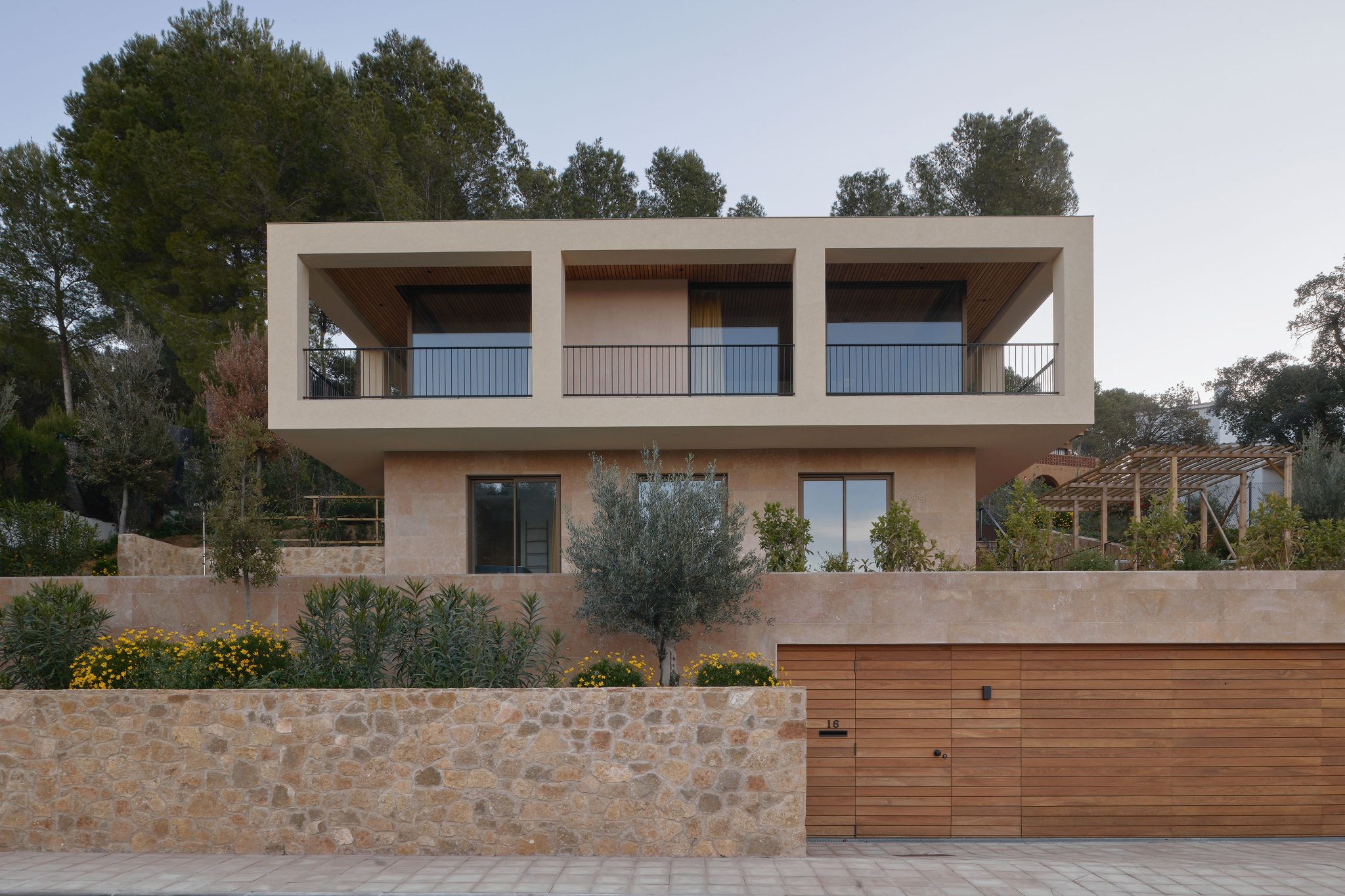 The villa is placed like a solid monolith in the sloping landscape. The natural colours and materials ensure optimal integration into the Spanish landscape. The basis is formed by a sand-coloured natural stone from a quarry near Ulldecona, some 300 kilometres south on the Spanish coast of Tamariu. The terraces and the facade of the first floor are cladded with natural stone. Equal treatment of all surfaces makes the plinth of the villa appear to be gouged out of the rocky mountains. The facade of the cantilevered floor is entirely finished with a coarse plaster, in the same colour tone as the sand-coloured natural stone. By applying different materials, a subtle transition is created which makes the cantilever seem to float. The light sand colour is complimented by aluminium window frames with a dark bronze hue and elements of dark brown wood.