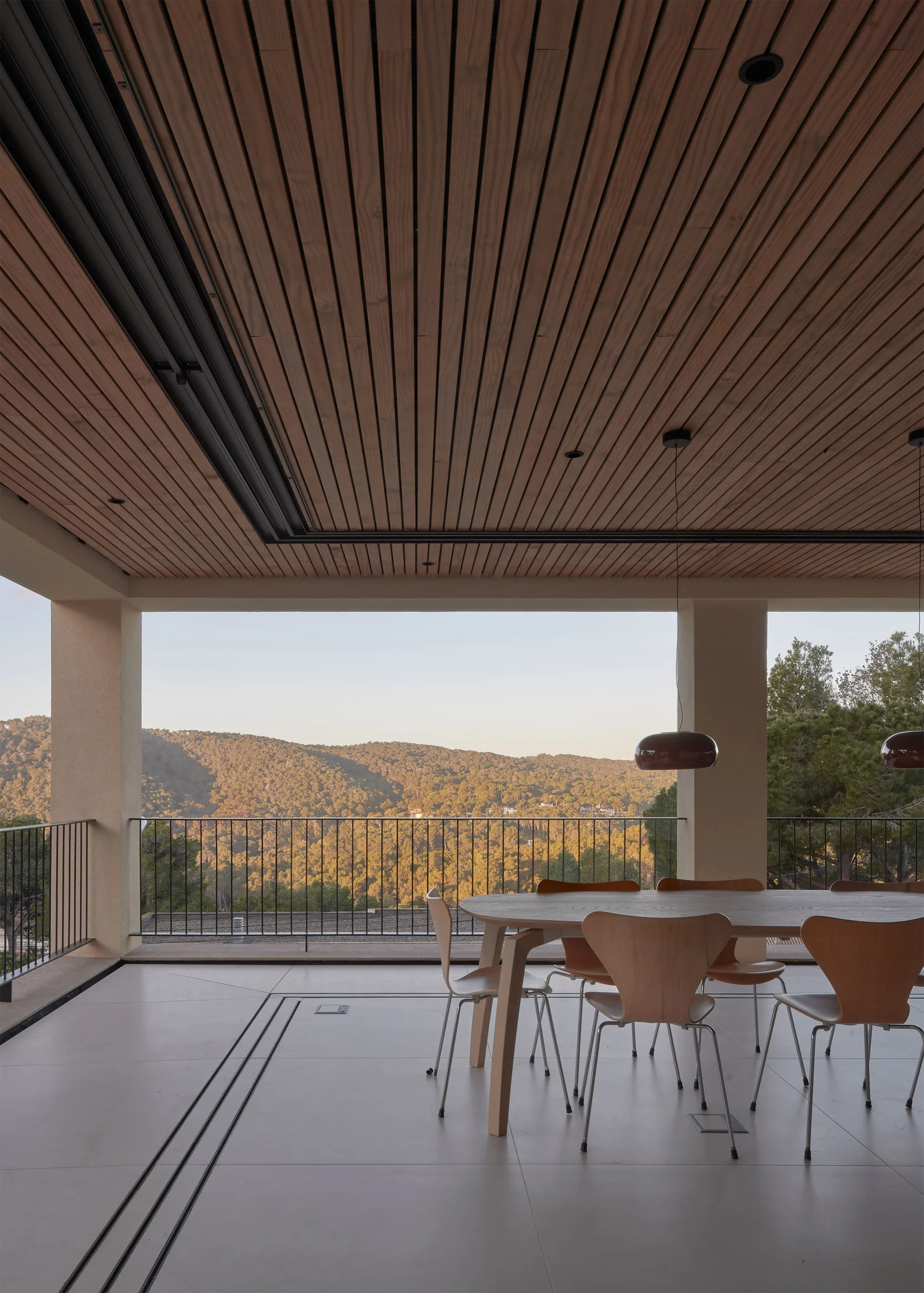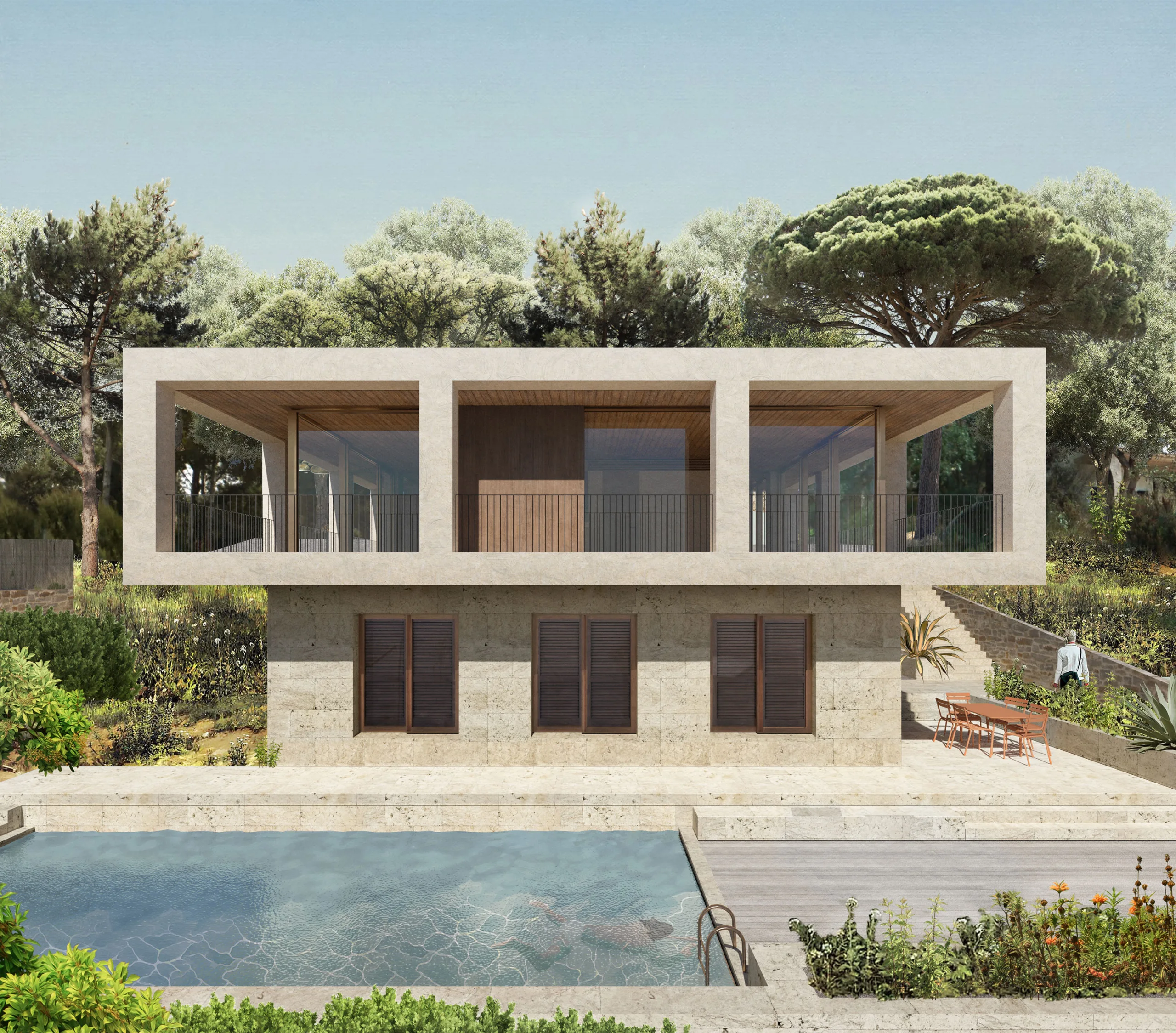 The villa is composed of a simple cube of 11 by 11 meters and two residential floors. On the top floor, an impressive cantilever provides shelter from the burning sun. This floor functions as an all-sided living space: floor-to-ceiling sliding doors all around allow for views on the surrounding landscape. The large horizontal openings in the cantilever frame the landscape like a composed panorama. The cantilever makes vertical sun protection superfluous, guaranteeing generous views and daylight entry.