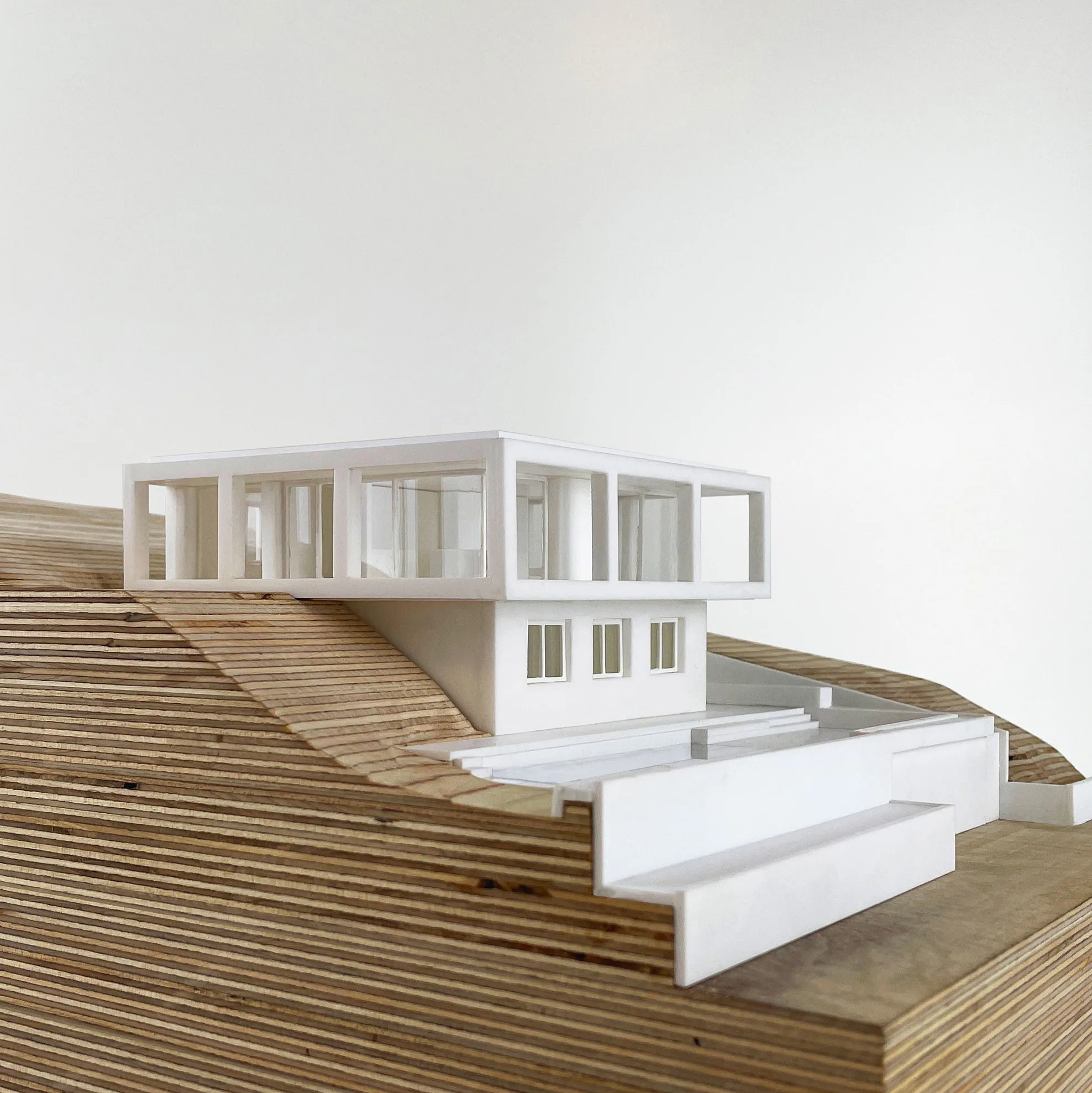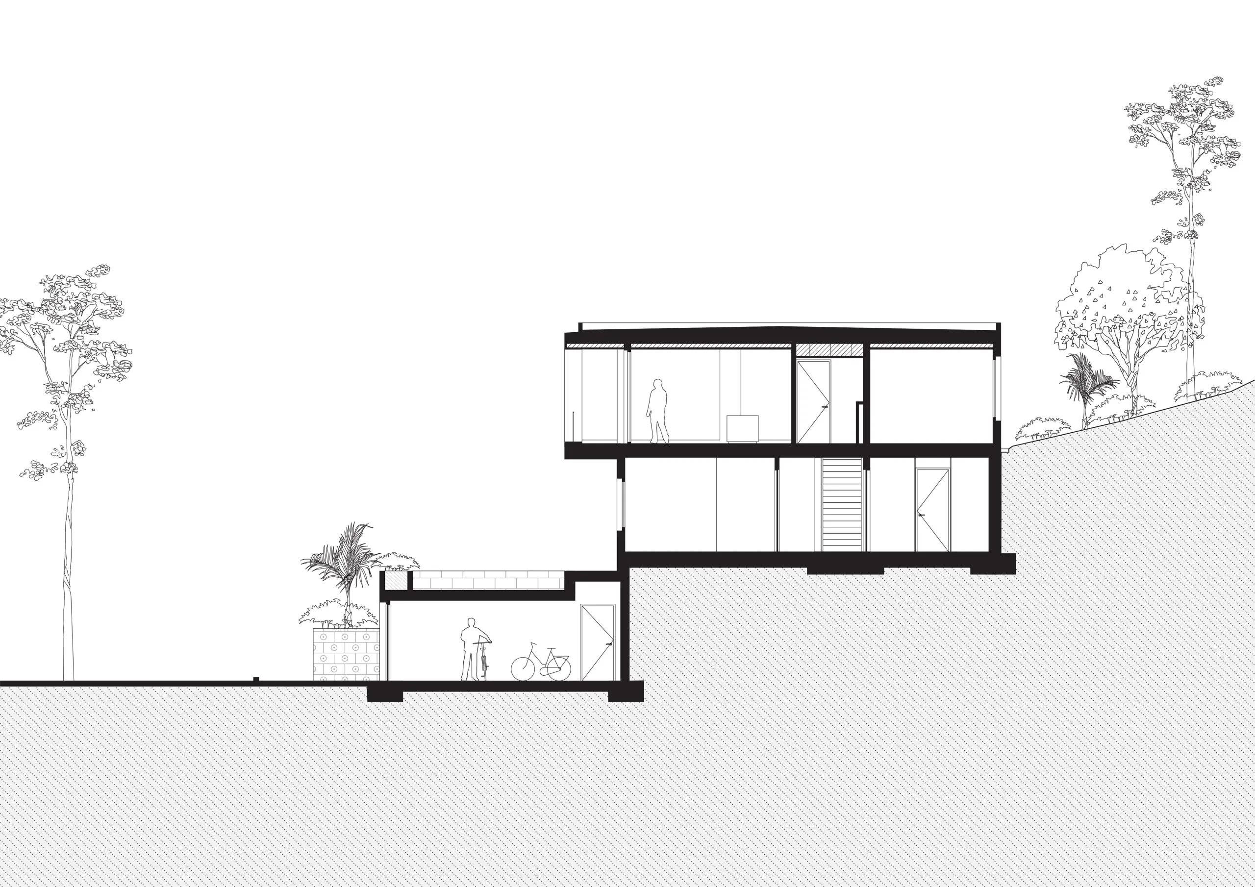 The ground floor is partly pushed into the mountain and mainly accommodates sleeping rooms and technical spaces. The villa can accommodate as many as 10 people. The staircase leading up to the entrance on the east side of the plot continues from street level to the green back garden of the plot. The staircase cuts through the landscape in a straight line. On the west side however, the landscape gently slopes like a green hillside against the bottom of the cantilever. The main entrance to the villa is not on the front but rather on the east facade, halfway up the stairs so the outdoor sitting area is not crossed when entering the villa. Different types of outdoor spaces are aligned along the villa and separated by subtle height differences. The outdoor spaces are bordered by a planter that acts as a railing and green planter at the same time. The outdoor terrace is complimented by an outdoor kitchen, which is integrated into the facade. Here, too, the continuous circulation space has a logical conclusion: in the lowest part of the terrace, along the south façade, lies a spacious swimming pool for hot summer days.