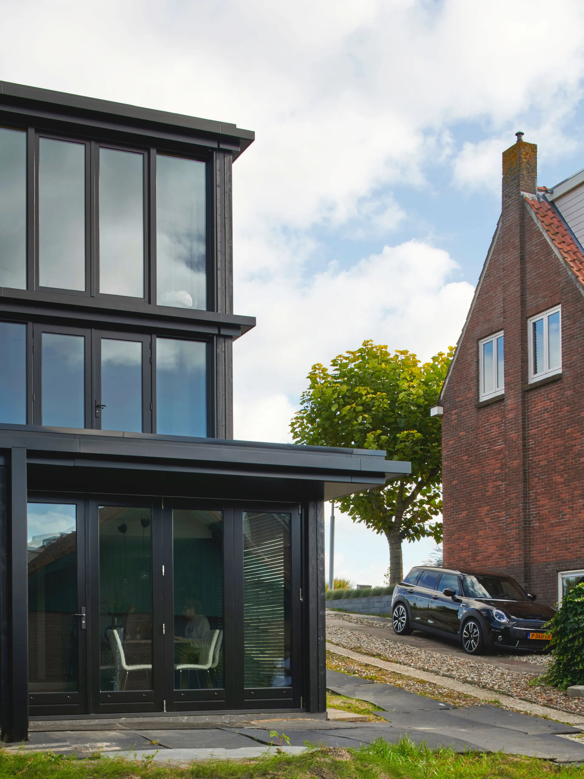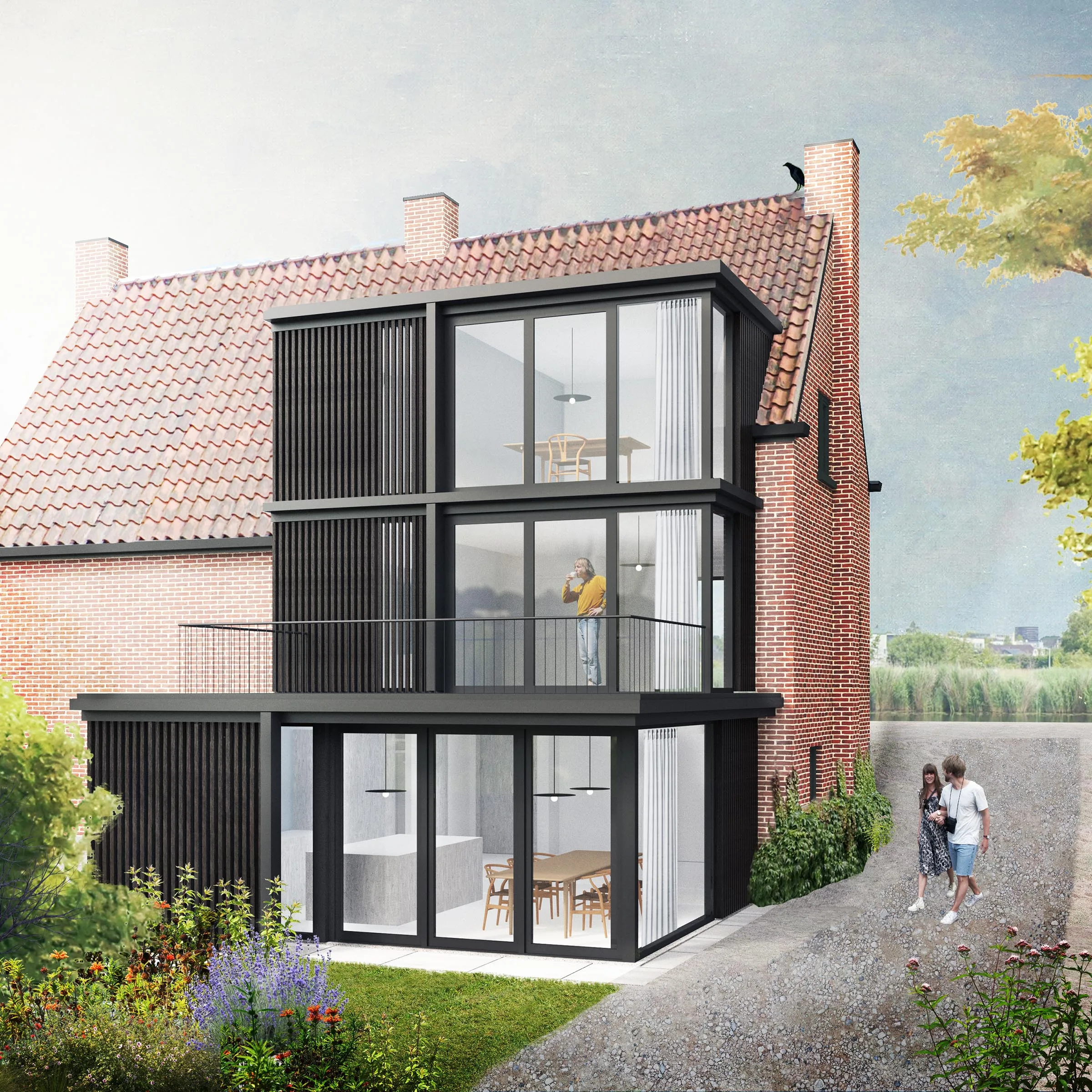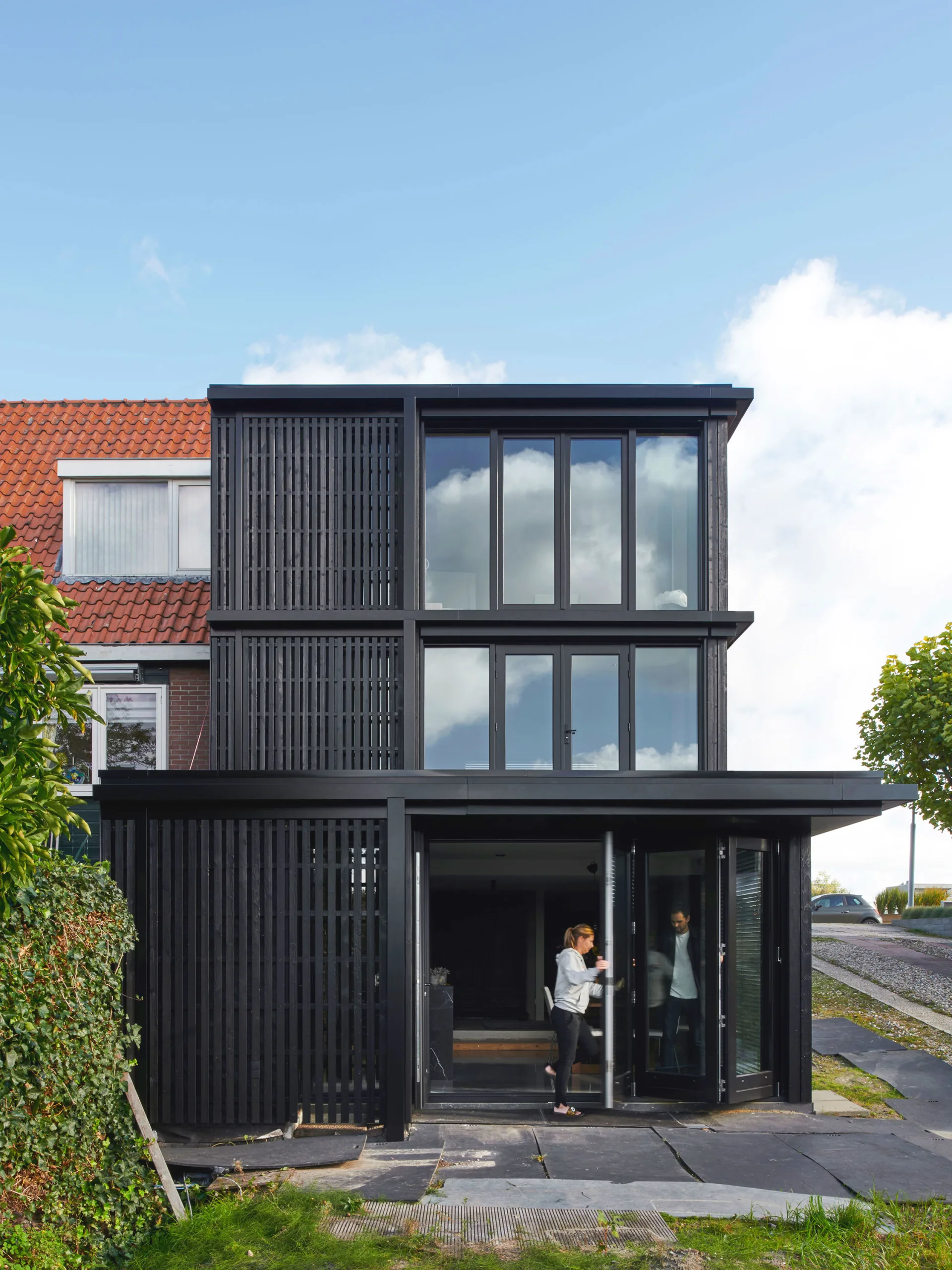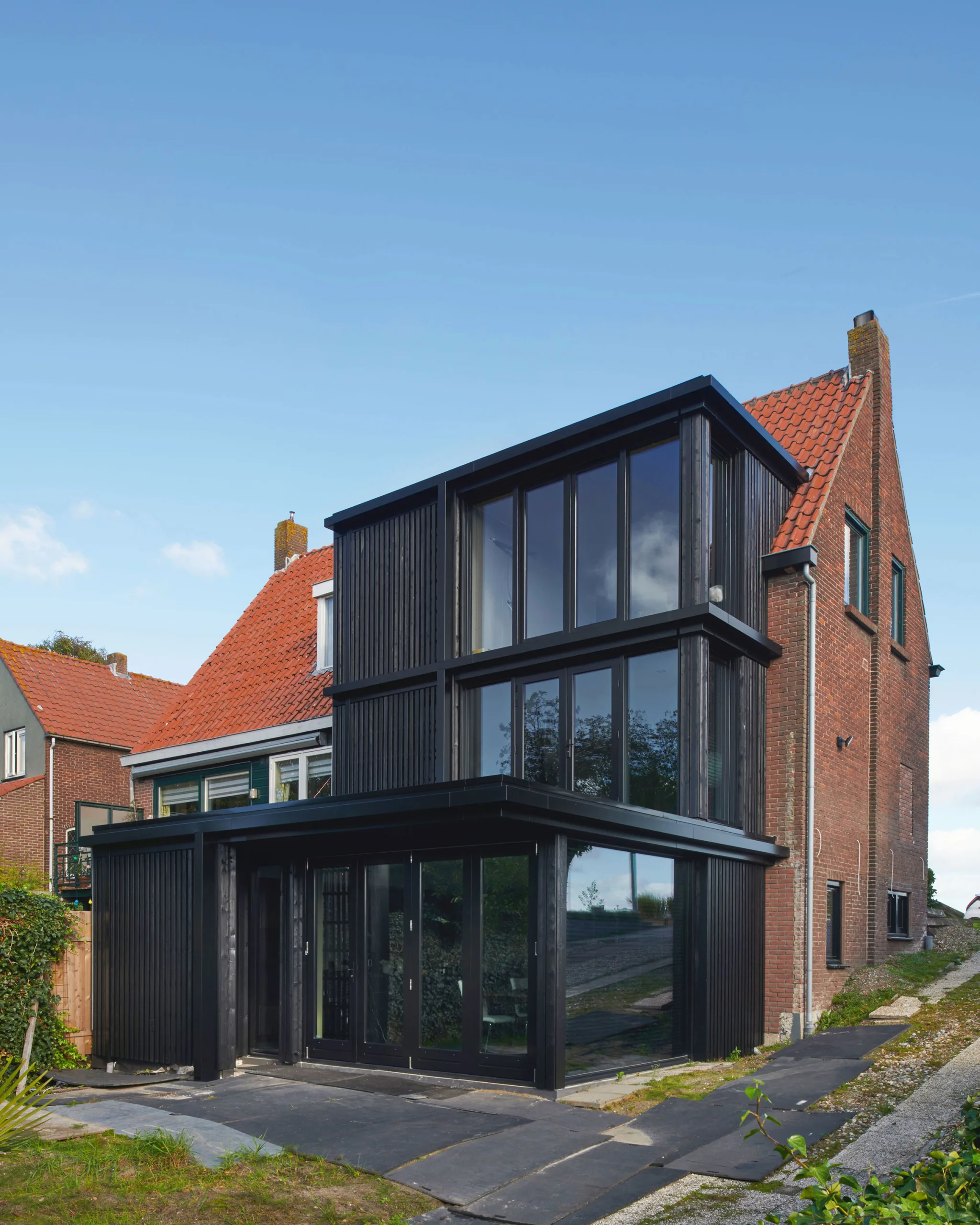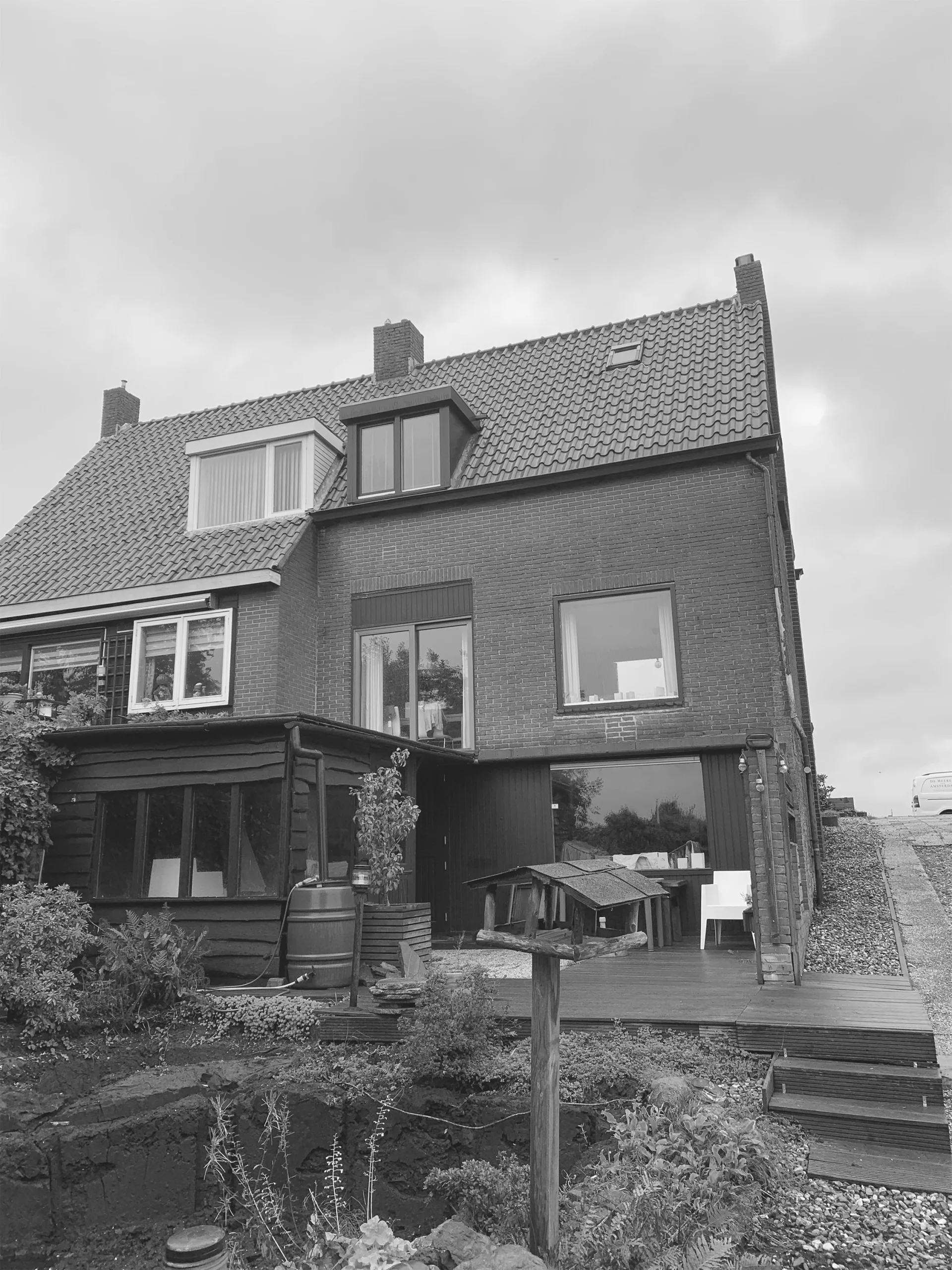 Design for the refurbishment and extension of a semi-detached house on a dyke in Badhoevedorp, North Holland. The original layout of the semi-detached house is restored and enlarged with a contrasting black extension. Due to several modifications the interior of the house has become a labyrinth of unorganized spaces, the new extension not only adds space but also restores the clear and original floor plan. The house will be divided into three zones; a functional zone containing compact elements such as stairs, toilet, shower and storage. Second is a small distribution zone for movement and the third zone contains the main living spaces. A closed, semi-open and open wooden structure amplifies the three zones in the facade.