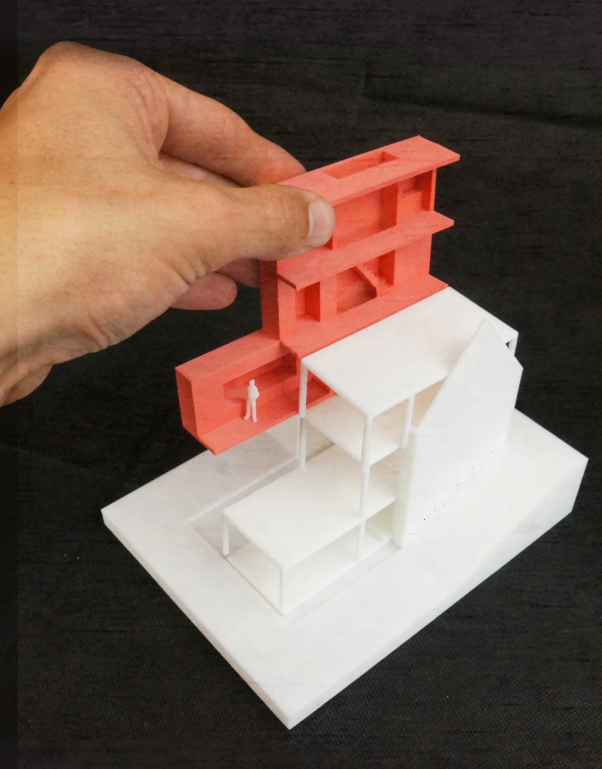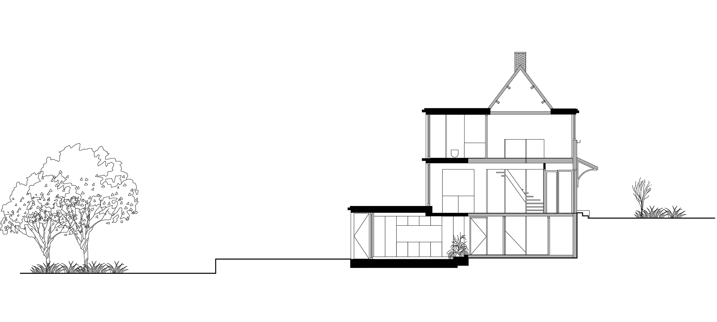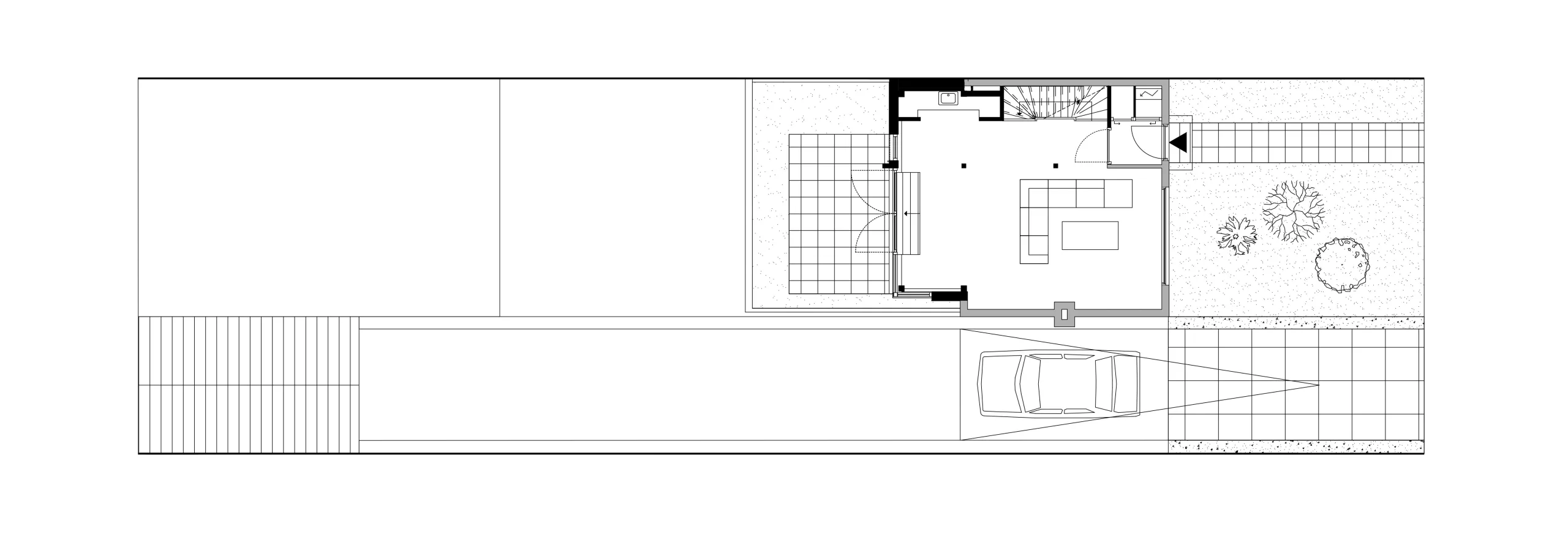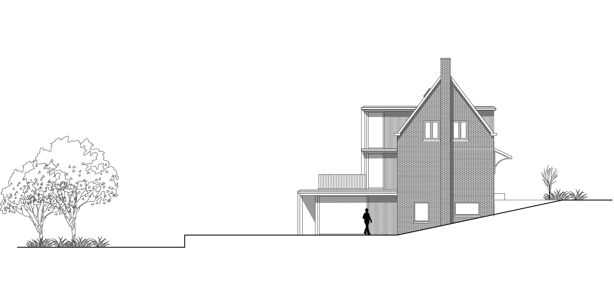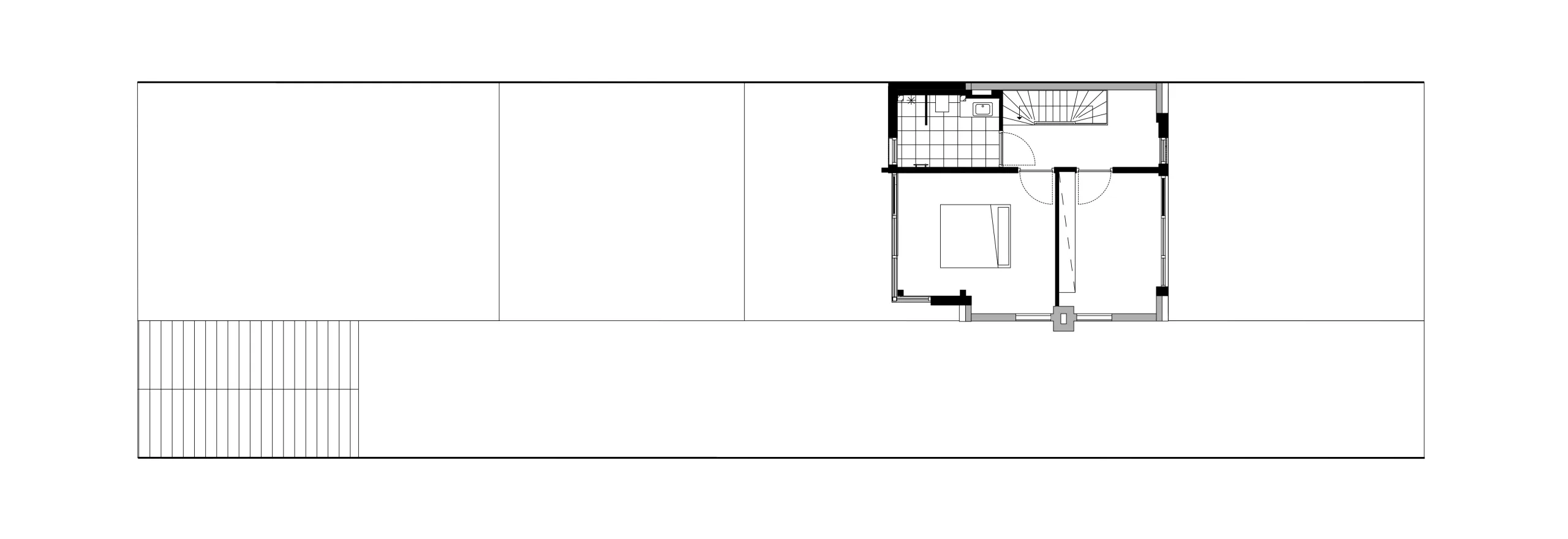 Design for the refurbishment and extension of a semi-detached house on a dyke in Badhoevedorp, North Holland. The original layout of the semi-detached house is restored and enlarged with a contrasting black extension. Due to several modifications the interior of the house has become a labyrinth of unorganized spaces, the new extension not only adds space but also restores the clear and original floor plan. The house will be divided into three zones; a functional zone containing compact elements such as stairs, toilet, shower and storage. Second is a small distribution zone for movement and the third zone contains the main living spaces. A closed, semi-open and open wooden structure amplifies the three zones in the facade.
