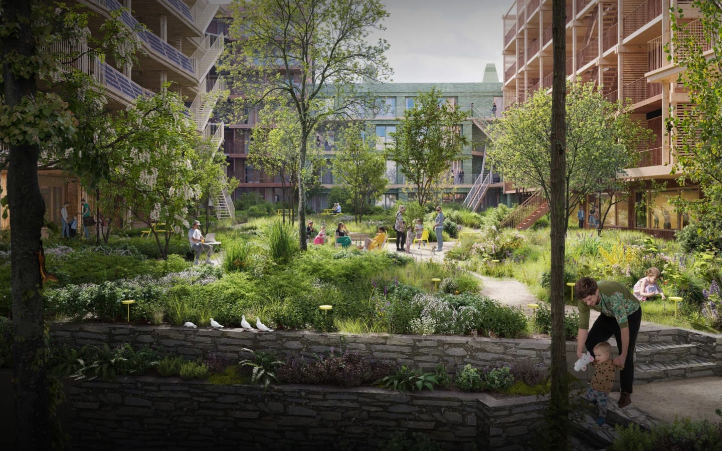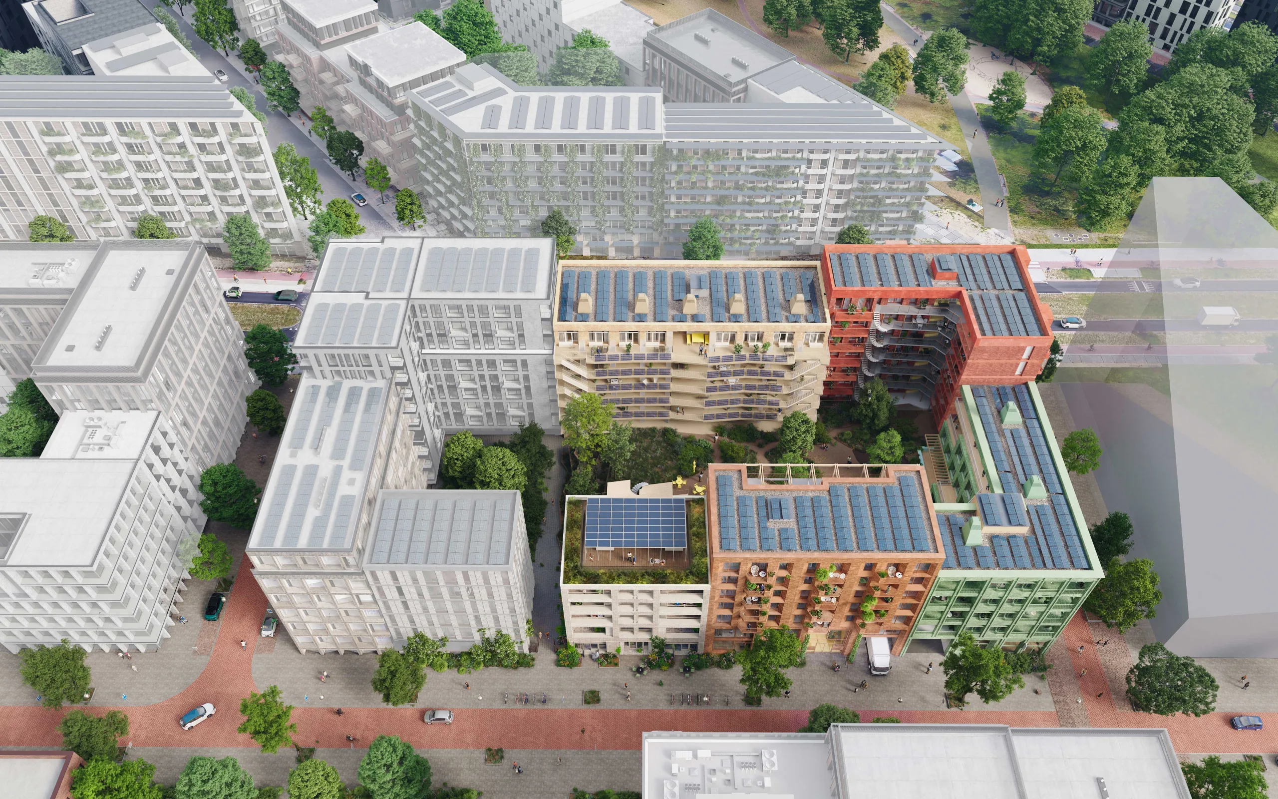 Hibi’s leafy and lush courtyard garden is a habitat for a wide variety of native plant and animal species. It is an ecological stepping stone between Morgenstondplantsoen and Park Somerlust. Together with plot 10A, the garden forms a tight link and an important urban biotope. These living spaces for plants and animals are an inseparable part of the architecture and, with this nature-inclusive approach, underscore the connecting qualities that characterize Hibi. The garden is designed so that social interaction, climate adaptation and nature inclusiveness are in line with each other. Common areas in the courtyard garden provide residents with an opportunity to meet and have social interaction, but also provide space for individual rest and relaxation. Rainwater is collected in retention crates on the roofs and in the courtyard garden, thus irrigating all the greenery with its own water. An important aspect of the landscape design is the link between Hibi’s garden and the adjacent plot 10A; a meandering system of stairs connects the differences in elevation. The foundation for nature is healthy soil so this transition consists of open ground in which native trees are planted.
