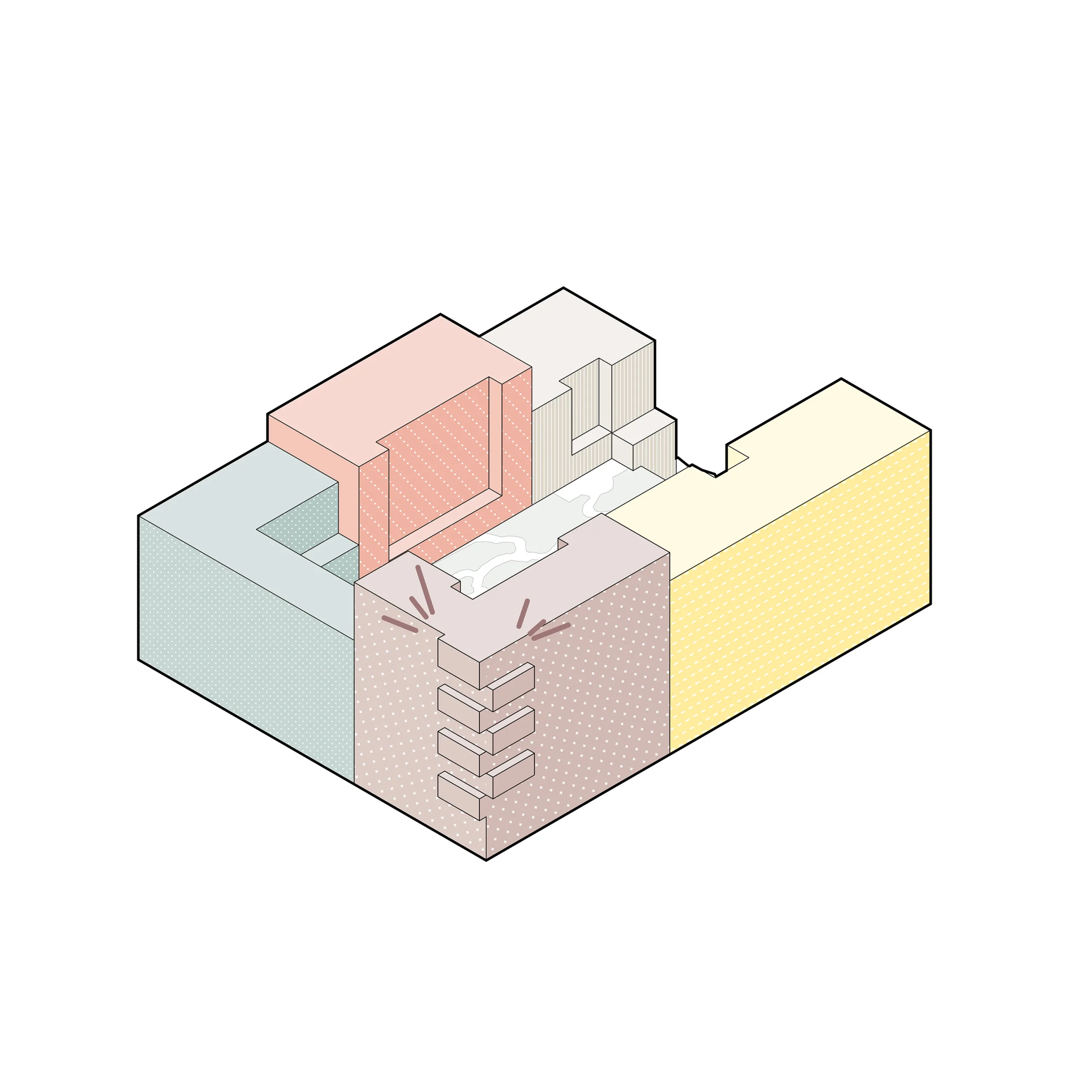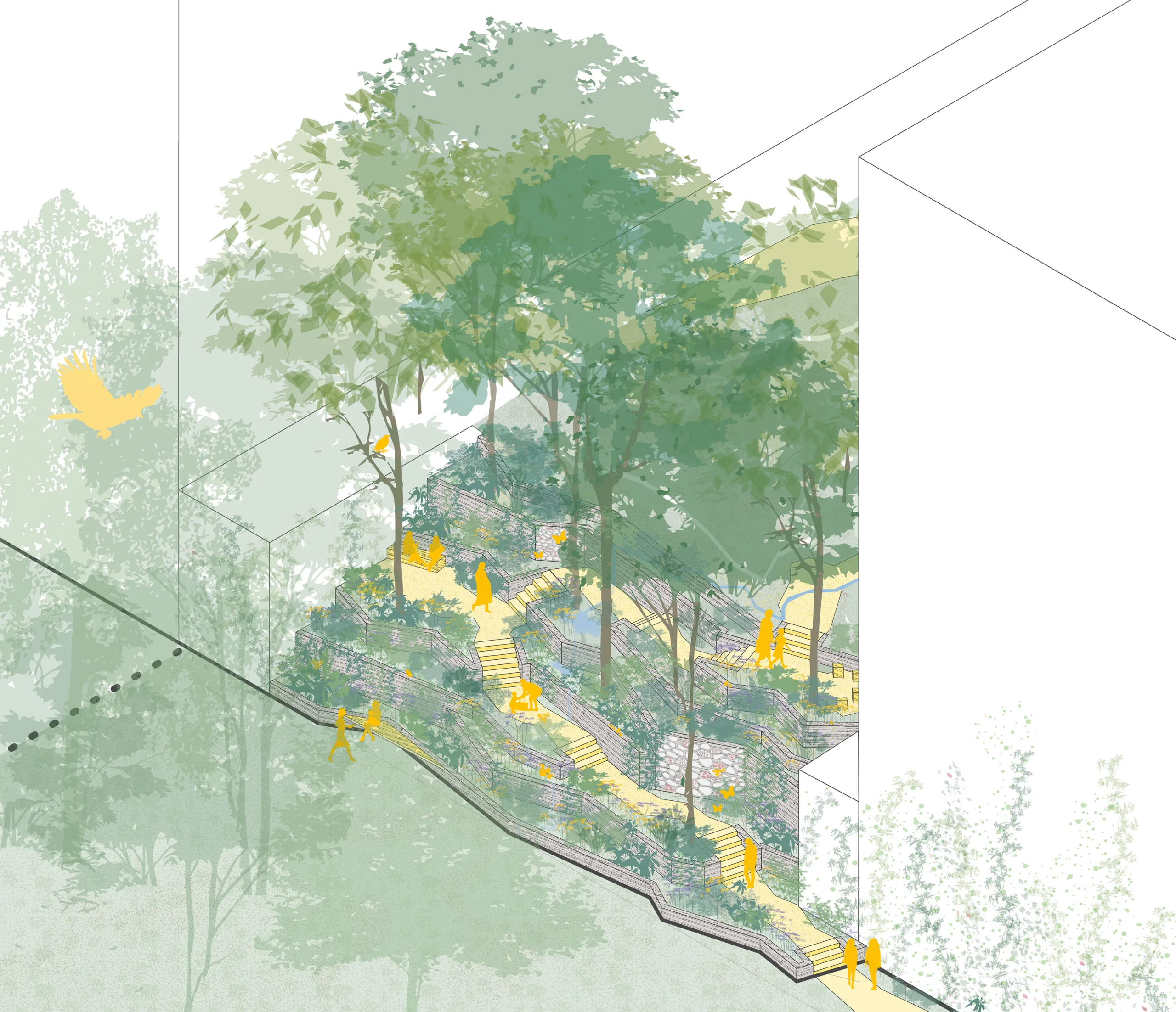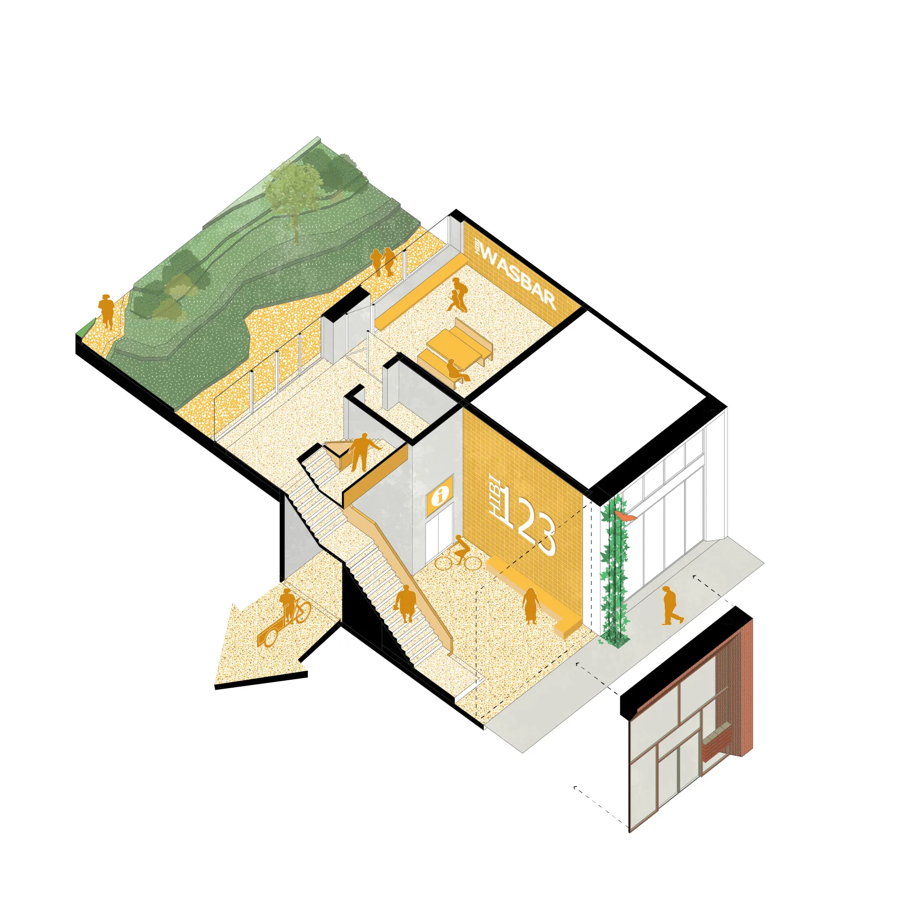 The design is inspired by Kintsugi (“golden connection”), a Japanese ceramic technique in which fragments are joined together using gold to form a new object. This makes the new cohesion, including the connections, more valuable than the individual elements. This new, more valuable cohesion, is called Hibi, which is also the name of our project. Our design integrates various aspects of the project (nature inclusiveness, sustainability, spatiality, program) into a coherent and unbreakable whole. The “golden connection” symbolizes the visibility of social interaction and sustainable use.