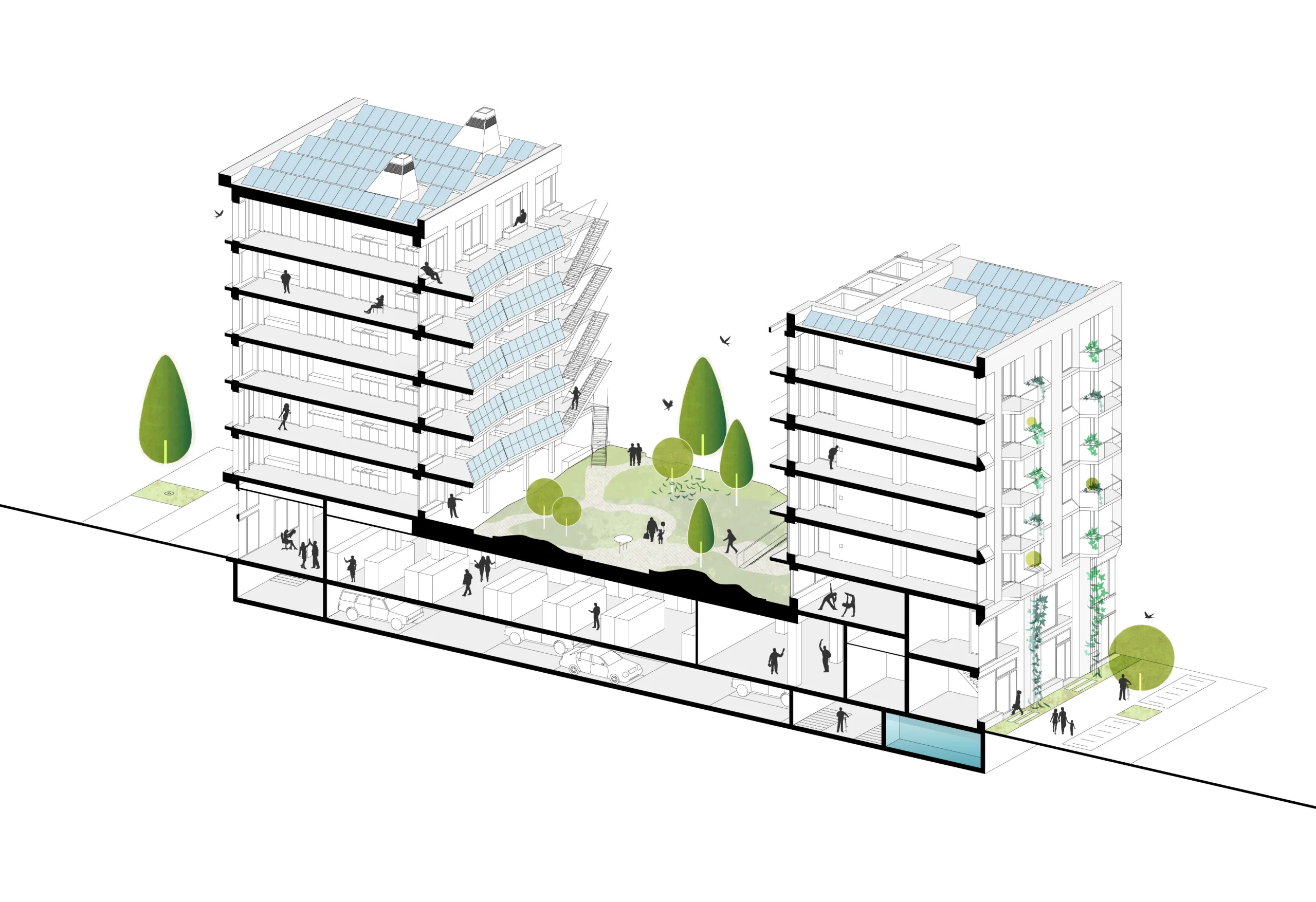 The secret of Hibi lies in the special entrances and collective spaces in the building block, the Hibi-spaces. By assigning collective programs to these, connections between users are created and the quality of living is enhanced. Hibi’s lush courtyard garden includes a garden room for communal use. There will also be a sports and laundry bar, a workshop area and a roof terrace. All of these spaces are accessible to all Hibi’s residents and have a direct connection to the courtyard garden.