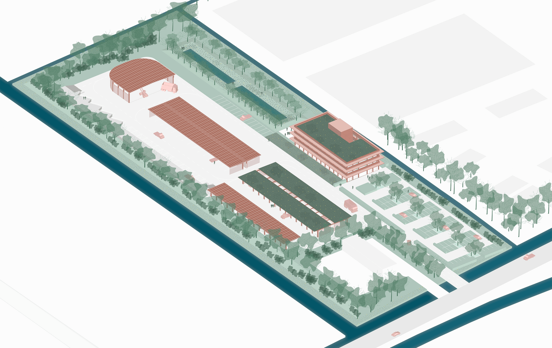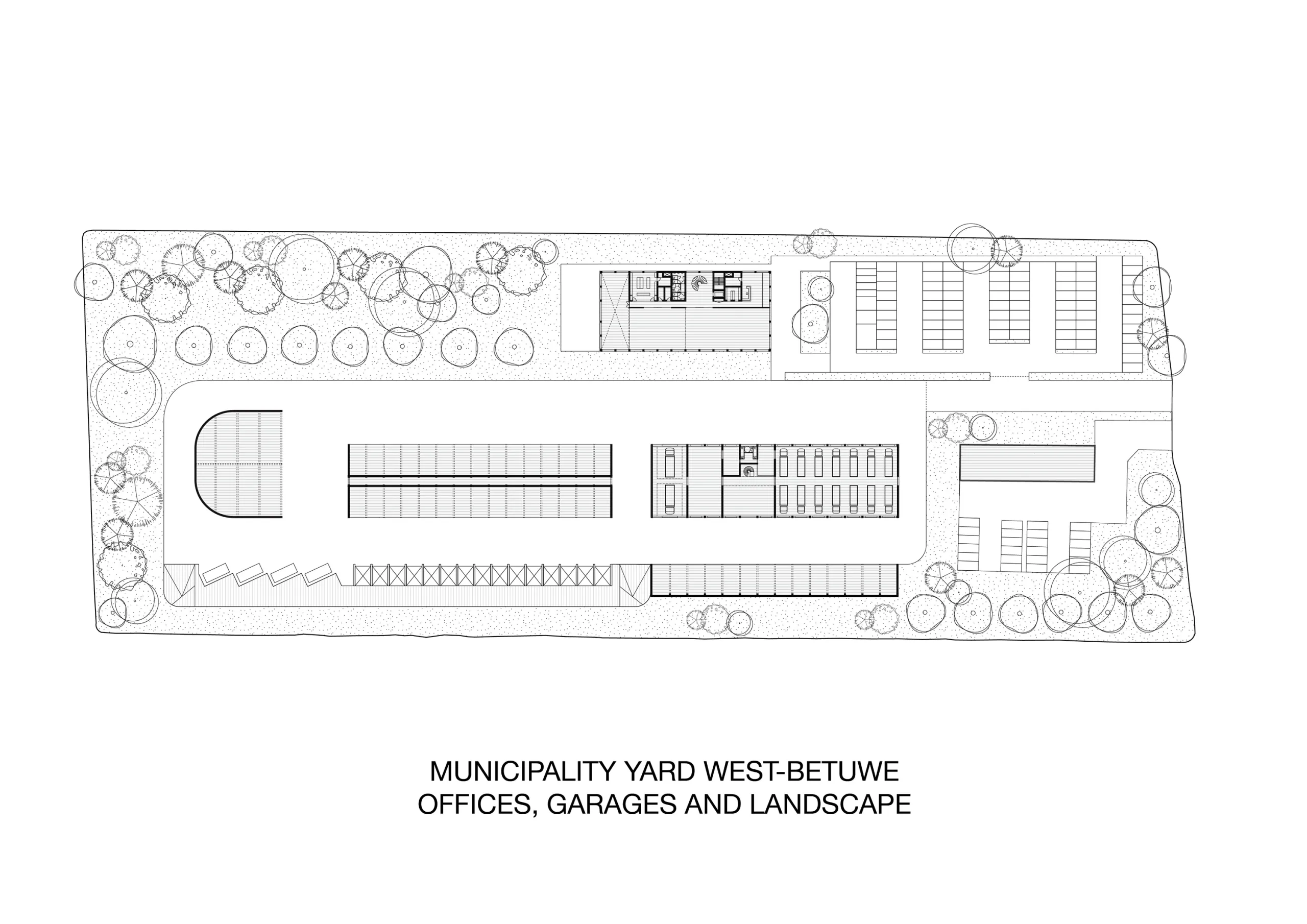 Municipality Yard West-Betuwe is a site of nearly 3 hectares that will be transformed into a sustainable and future-proof site with the goal of becoming the “greenest municipal yard” in the Netherlands. The design includes a functional site layout with an office building, garage, open sheds, salt depot, adequate maneuvering space and room for greenery and water storage. The design aims to strengthen the organizational synergy between the West Betuwe municipality and the province of Gelderland.