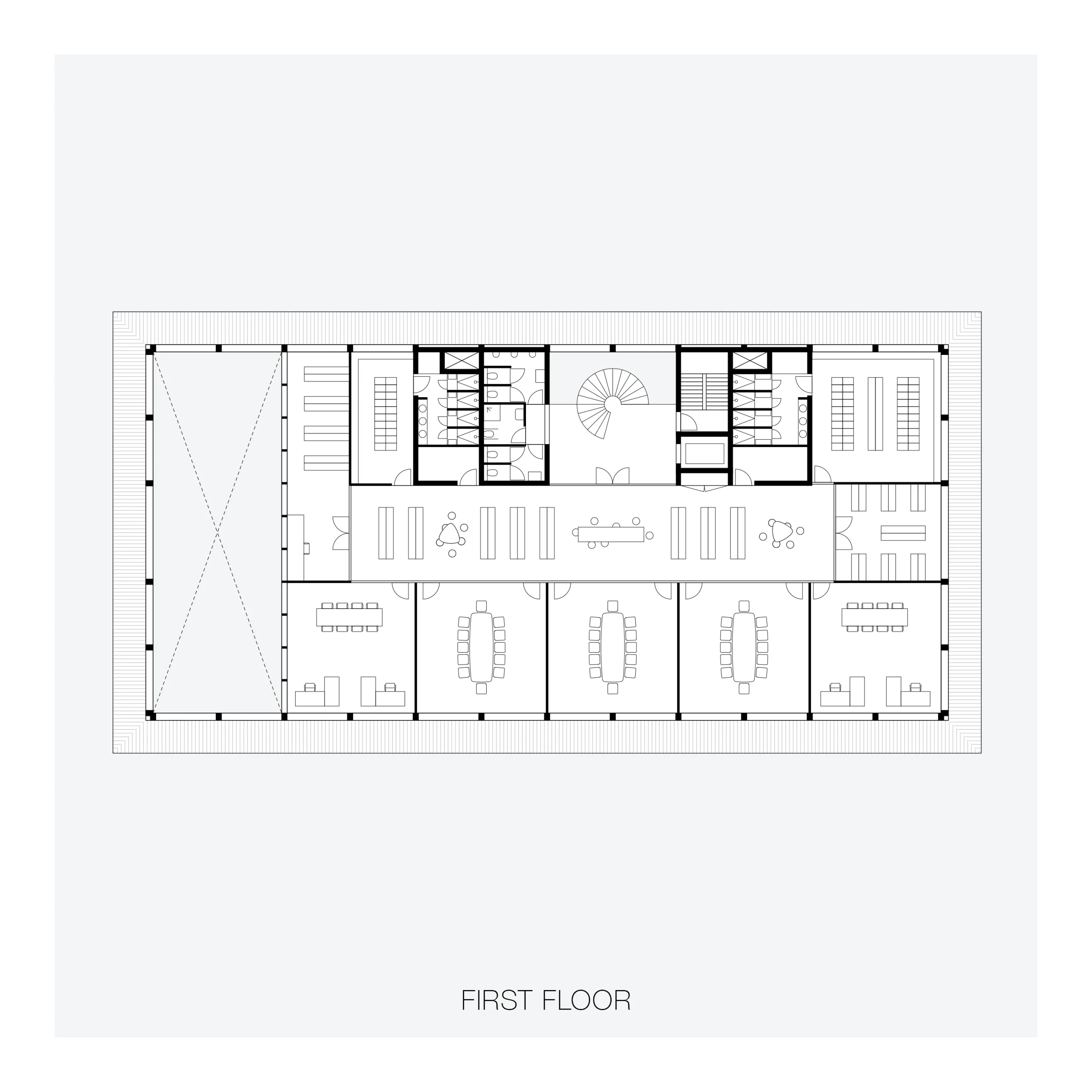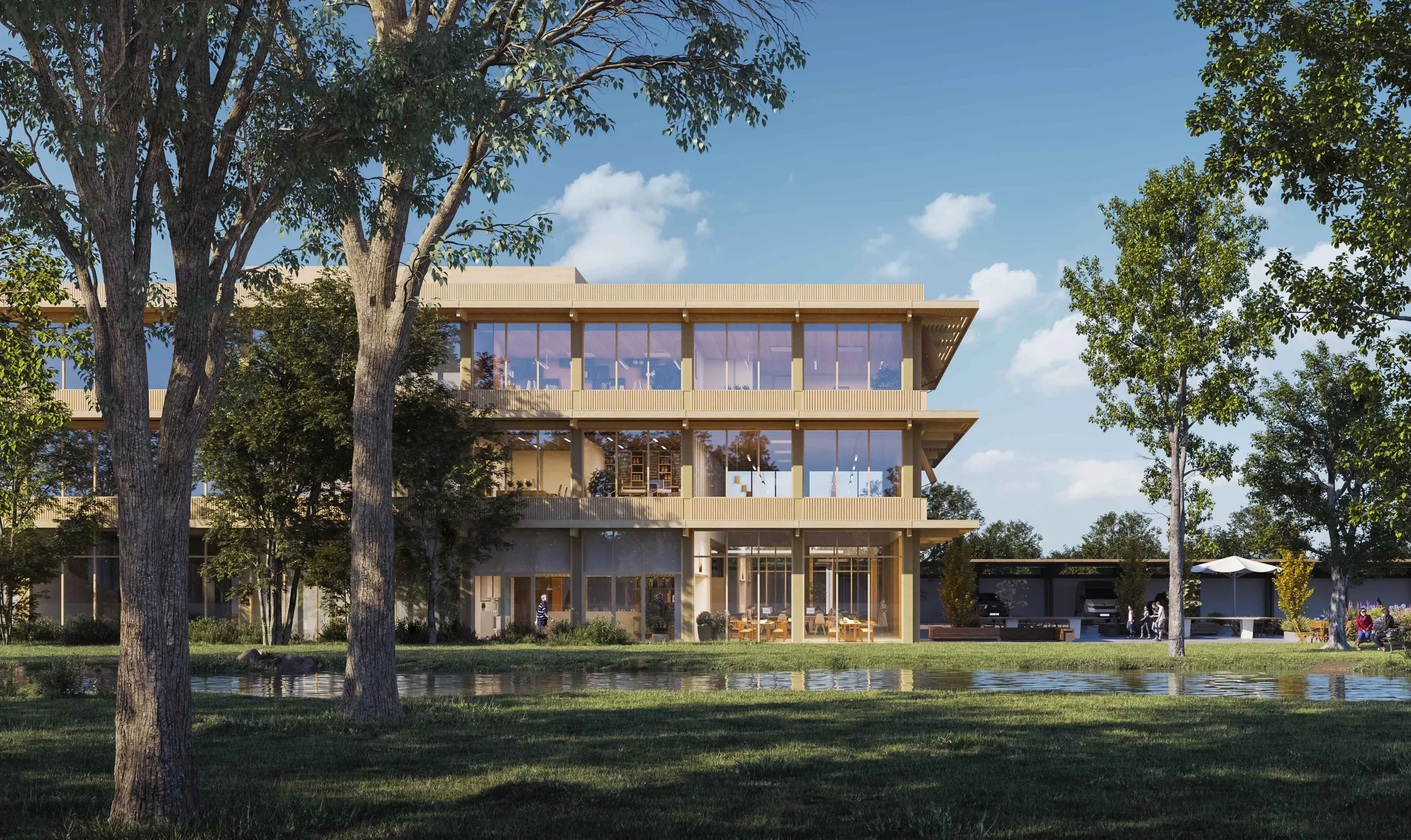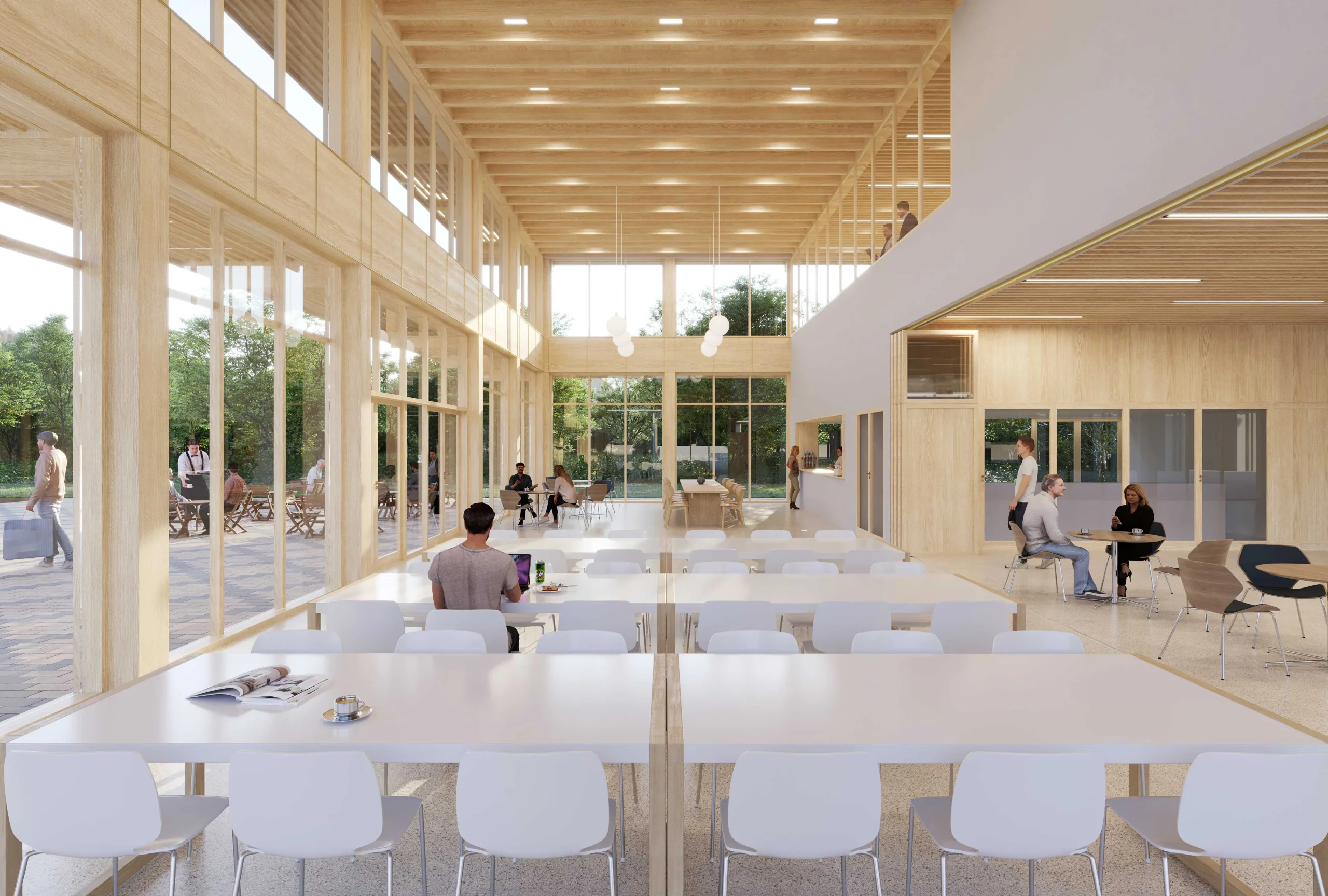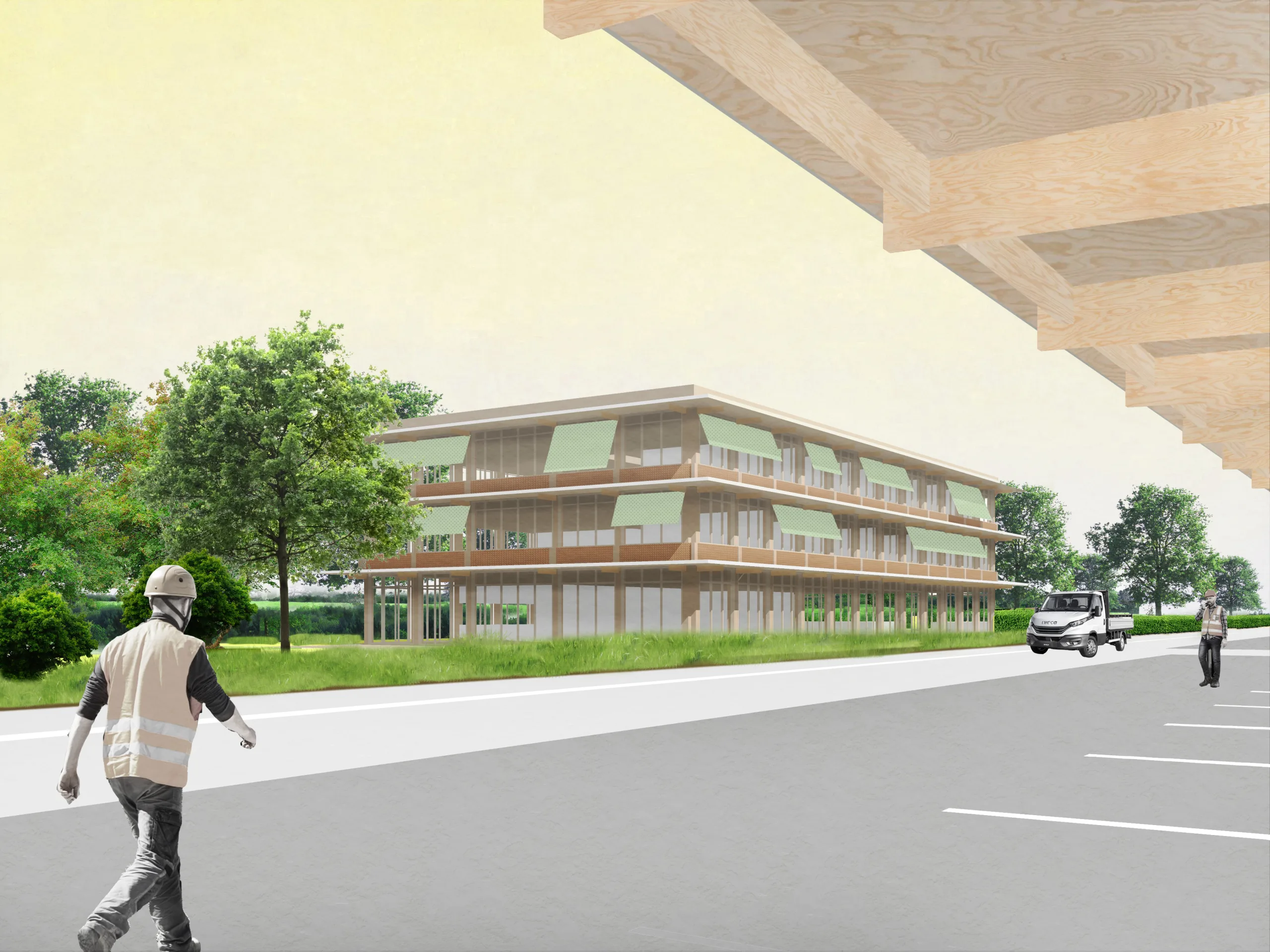 For the ensemble of modular wooden buildings, the design strives for maximum visibility and daylighting. A clear layout of the site, long sight lines and transparent facades improve visibility and thus safety for workers. The abundance of daylight also limits the use of artificial light. Slender cantilevers all around prevent overheating and enhance the horizontality of the buildings. The buildings consist largely of wooden materials and are built according to the principles of “open construction”: a radical separation of support, facade, installations and furnishings. This makes the buildings extremely flexible, large sections can be prefabricated and materials are detachable and reusable.
