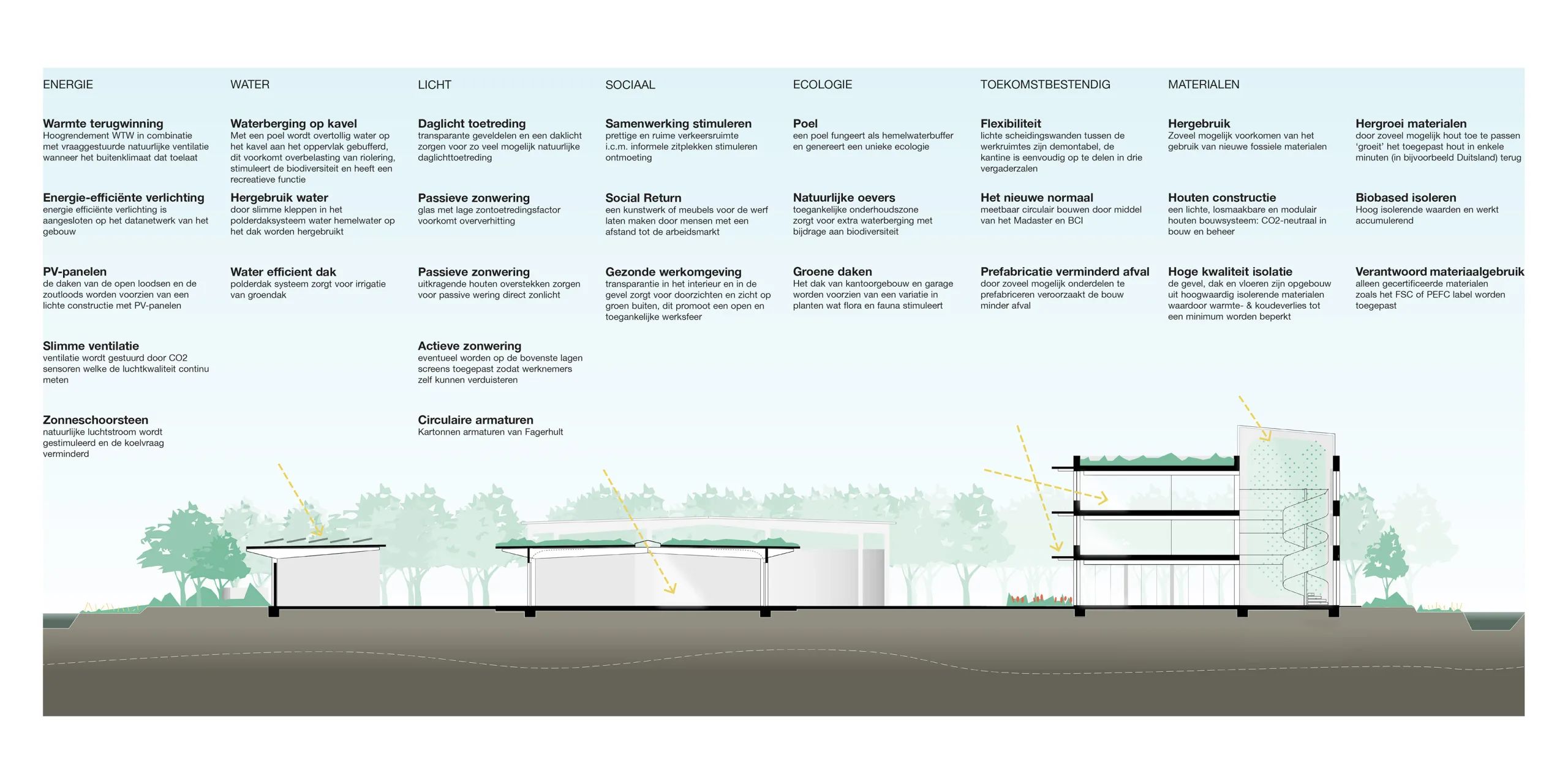 The design addresses a wide range of sustainability themes; energy, materials and lighting obviously play a role, but social sustainability, water, ecology and measurable circularity are also covered. The design was created as part of a tender by an integrated design team consisting of Natrufied Architecture and Keizer Koopmans (architect), Pieters Bouwtechniek (structures), Iv-Infra (civil engineering), Merosch (installations and sustainability) and Alba Concepts (cost and sustainability). Unfortunately, we did not win the tender.
