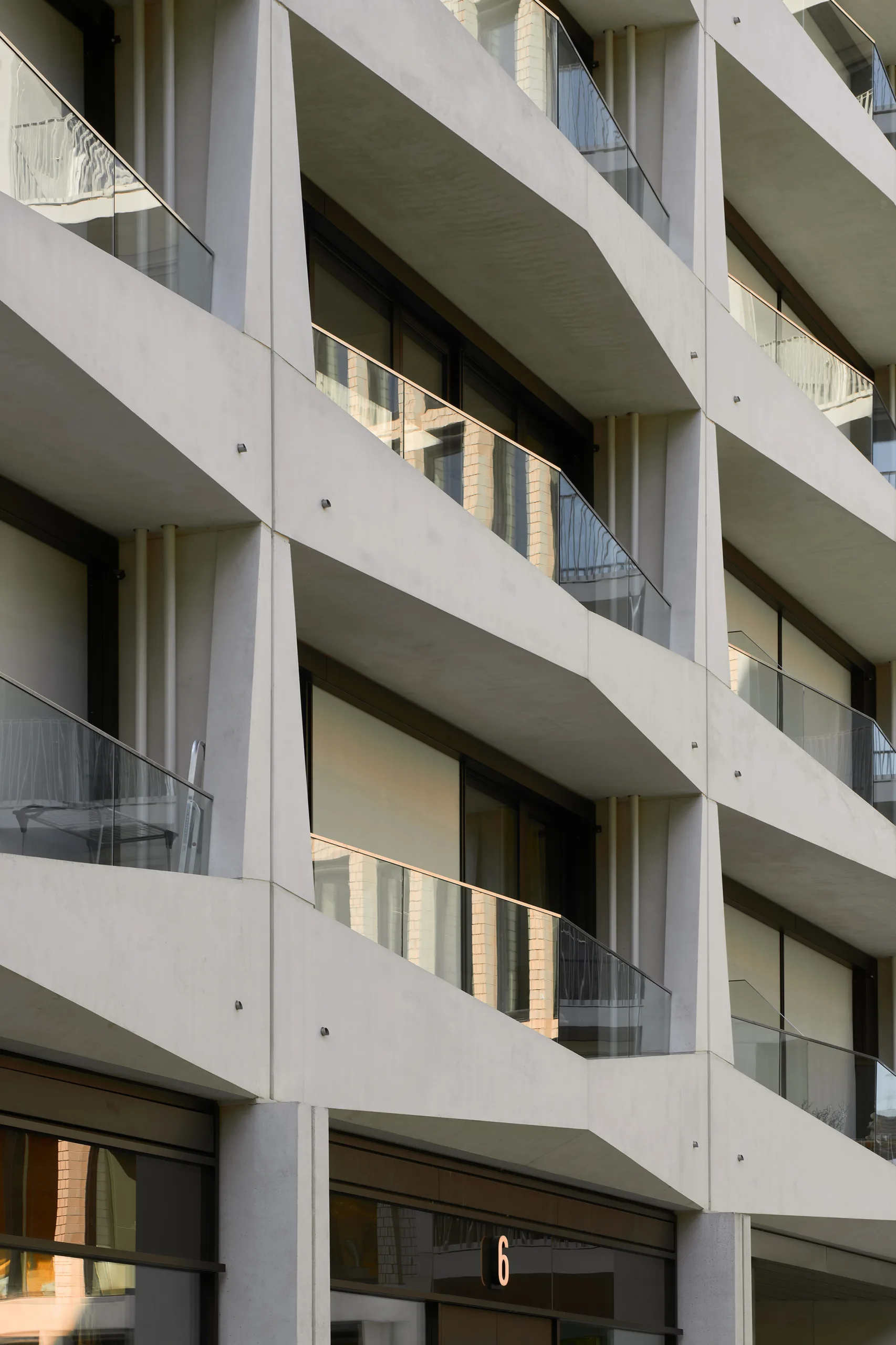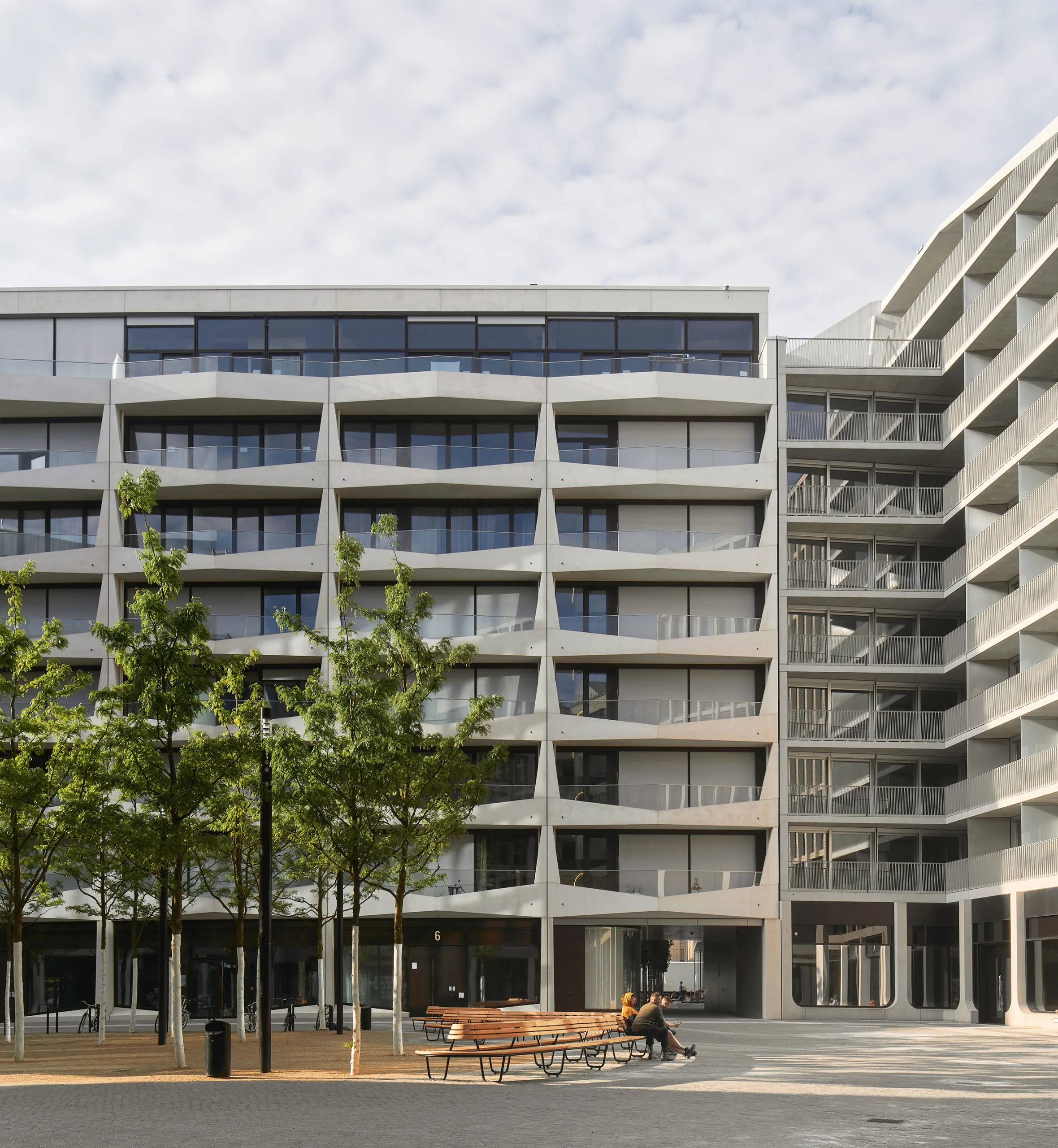 At the heart of a new masterplan, situated along the central square, PWR developed a new residential building with 36 high-end apartments. The characteristic nine meter wide concrete balconies create a palazzo effect: generous outdoor living space with views on the new square. The apartments are ideally suited for families or the elderly, there is sufficient moving space and no barriers throughout the building. The layout of the building is extremely flexible with multiple shafts on each side, a continuous grid in the ceiling for light connections and a repetitive facade system, allowing multiple configurations of each apartment. In the ground floor entrance lobbies are mixed with retail units.
