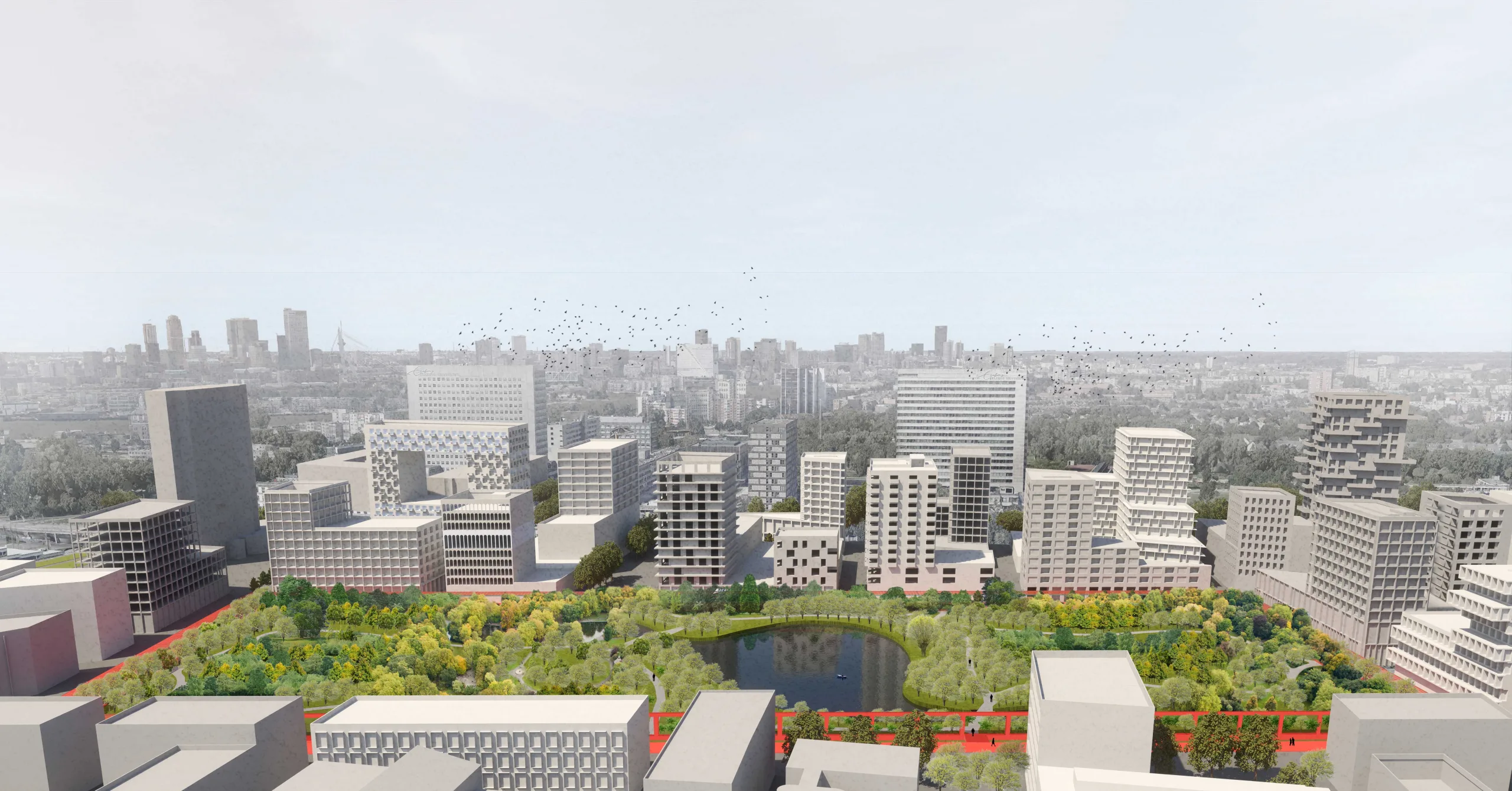 With high density and vibrant city life as a goal but with sustainable urban development as a must, we propose to make the best of both worlds in close proximity. A dense, multi-functional city organized compactly around a vast public park. We propose a minimal change to the existing layout and focus on the border of public versus private in order to team up with the different stakeholders of the park.