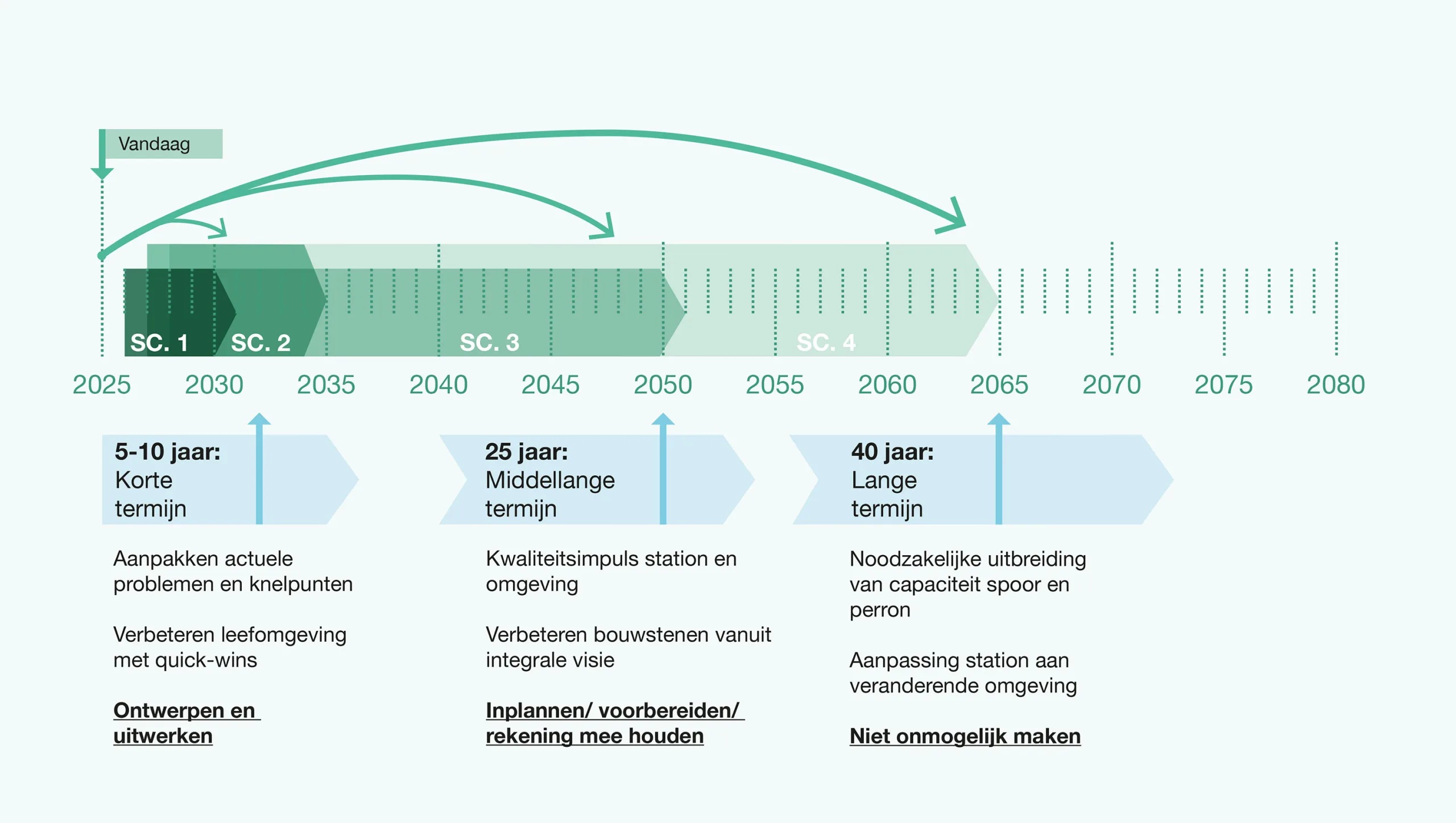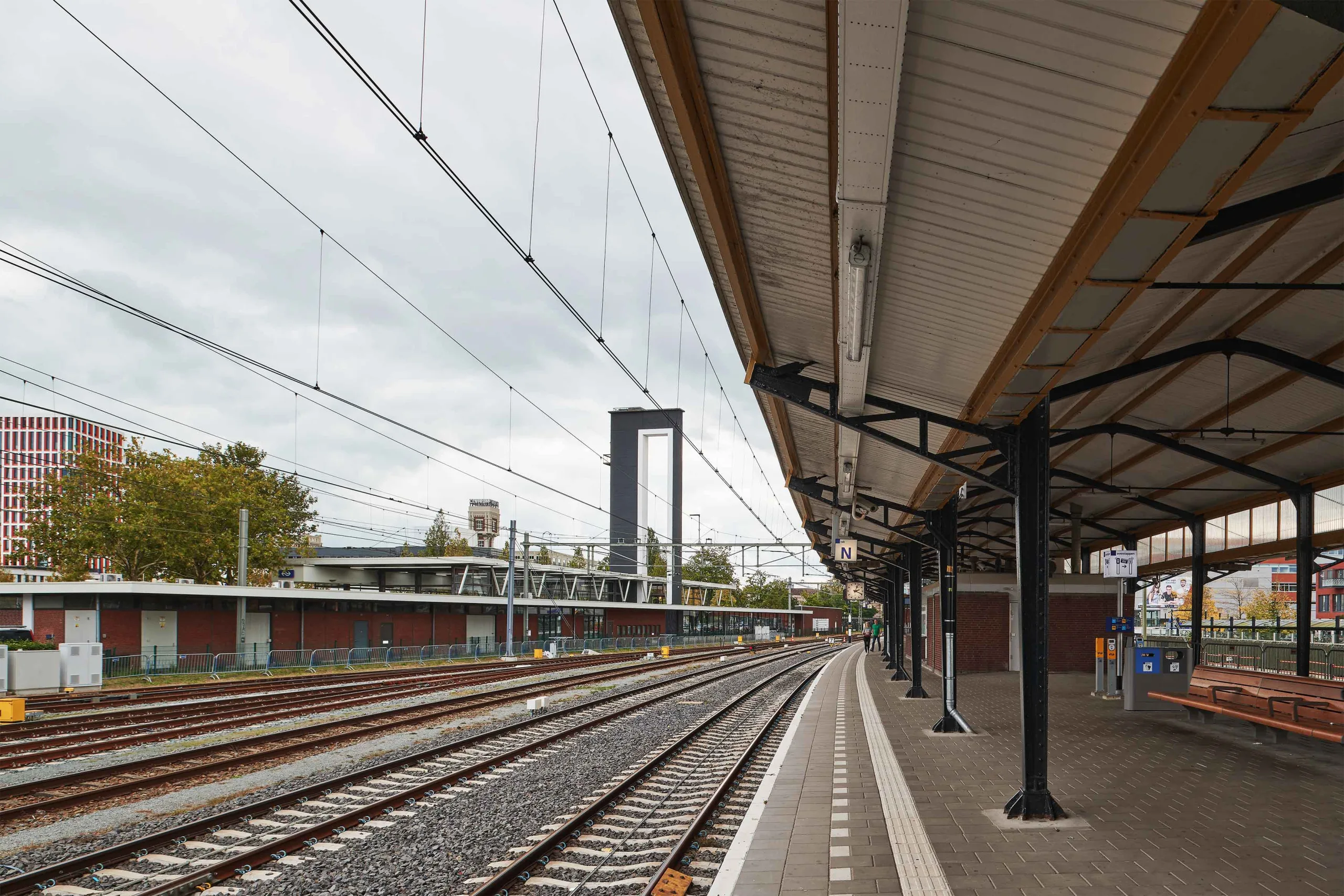 In this regard, Keizer Koopmans, together with Bureau B+B and Sweco Ingenieurs conducted a study and provided several scenarios to developed the city and train station in the future. In the short term, an improved tunnel, expanded common spaces, and extra bicycle parking provide a straightforward answer to some of the current problems. In the medium term, the study proposes a new inter-neighbourhood bridge connection with access points on both sides of the tracks, removing any barriers previously imposed by the station in the past. Alongside the bridge, a tunnel connects the north and south for cyclists under the tracks, increasing mobility in the area. The long-term vision sees this bridge becoming a new, contemporary station with expanded platforms, greenery, and compact entrance buildings at the heart of two new developments on both sides of the tracks, revitalizing areas previously isolated by the railway, taking full advantage of the location’s unique proximity to the canal to the north.