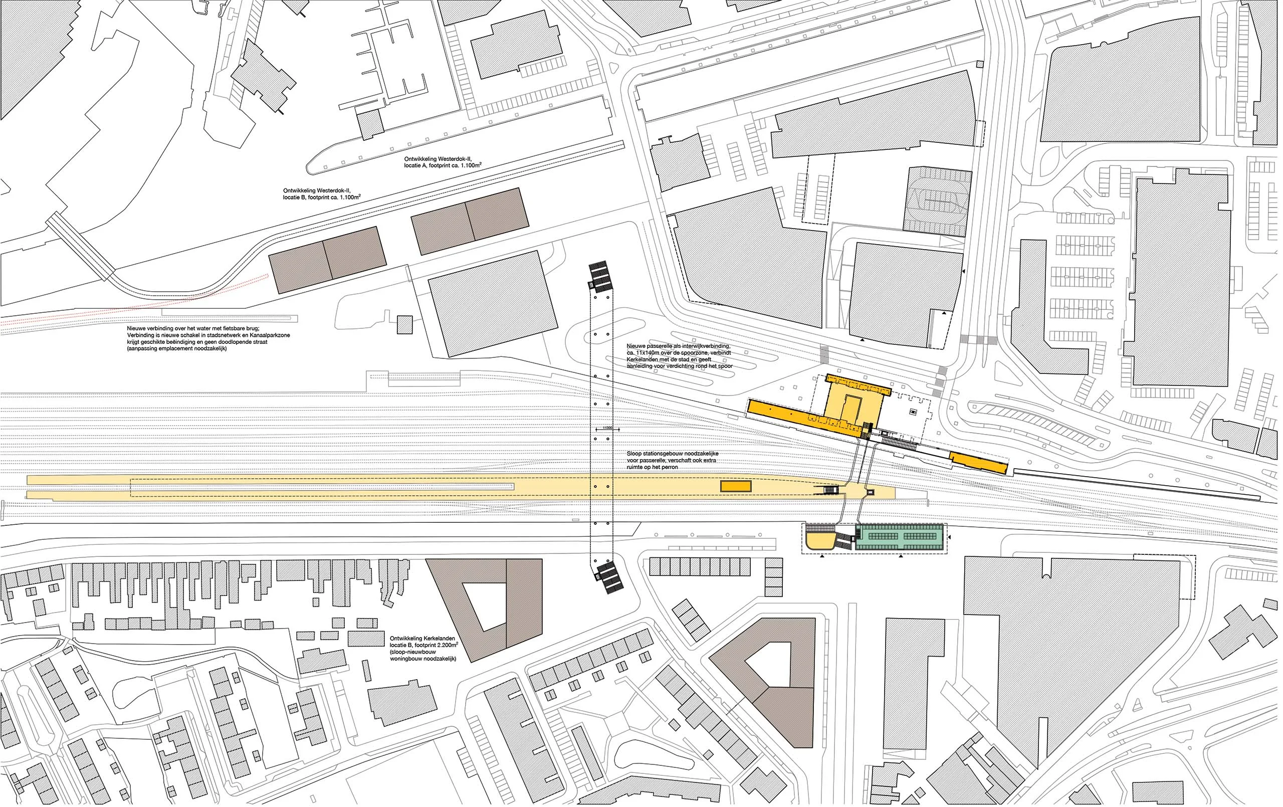 The long-term vision sees this bridge becoming a new, contemporary station with expanded platforms, greenery, and compact entrance buildings at the heart of two new developments on both sides of the tracks, revitalizing areas previously isolated by the railway, taking full advantage of the location’s unique proximity to the canal to the north.